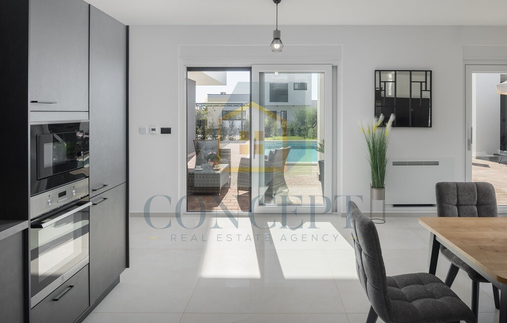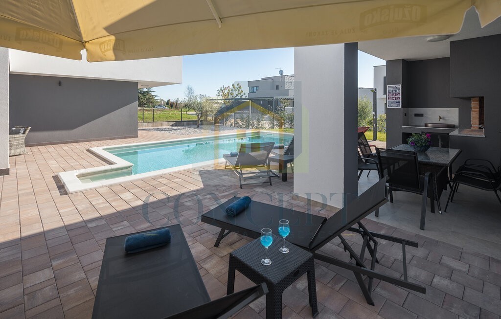 U dvorištu je ugrađen bazen površine 36 m² sa svom pripadajućom opremom, vanjska kuhinja s priključcima za vodu, struju i kamin te popločana plaža oko bazena. Na ostatku okućnice predviđen je tretirani travnjak s automatskim navodnjavanjem. Osigurano je parkirno mjesto za dva automobila.