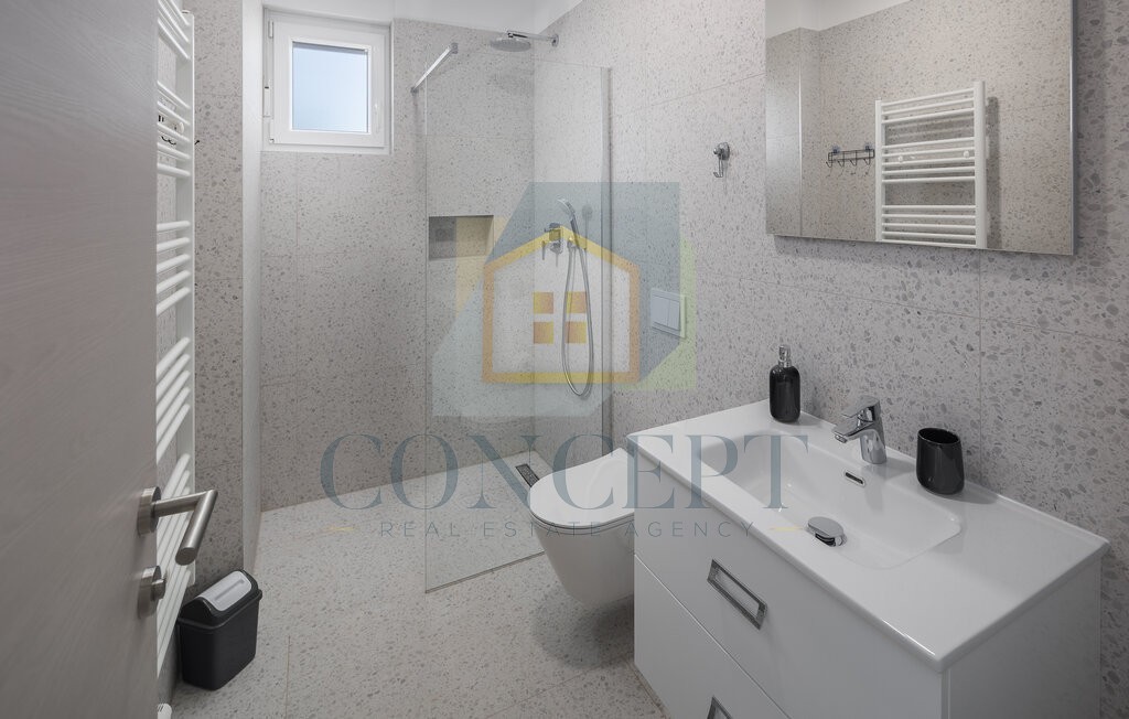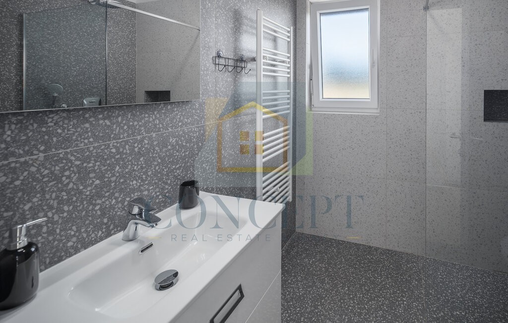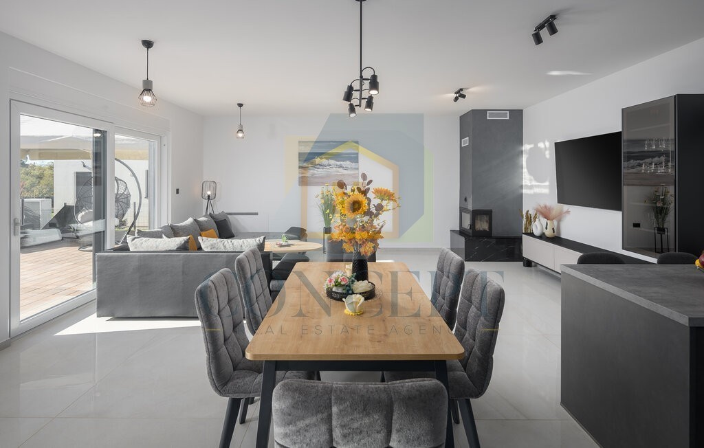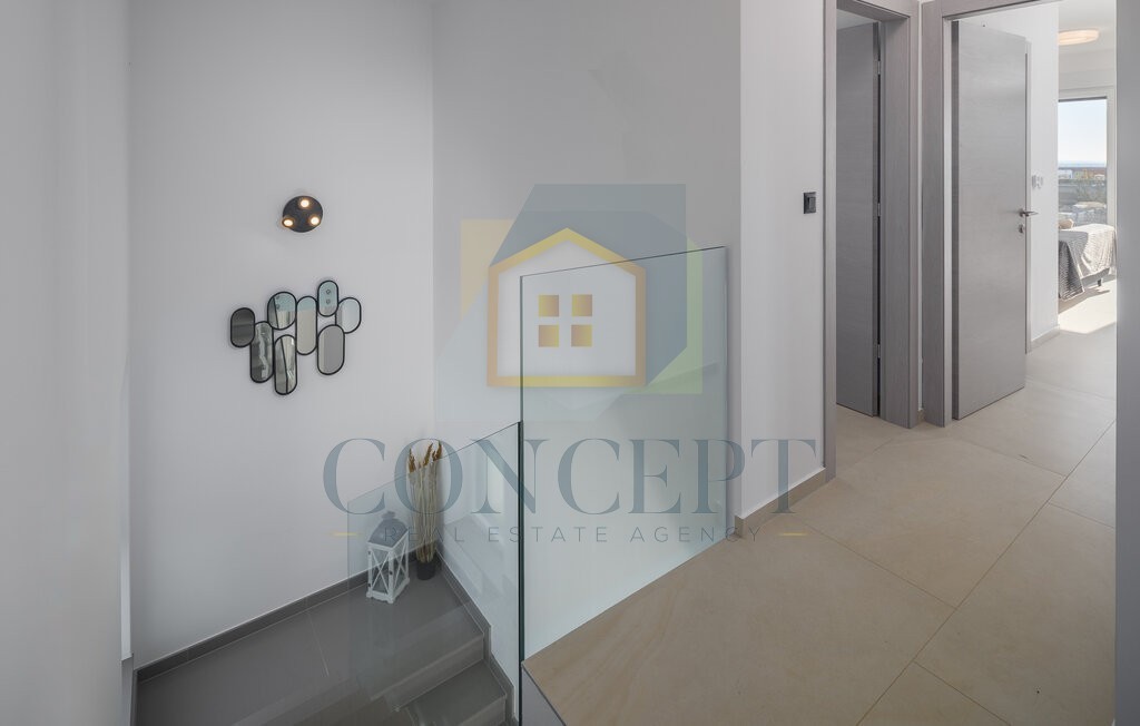 U prizemlju se nalazi dnevni boravak, kuhinja i blagovaonica, sve zajedno površine preko 50 m². Osim toga, prizemlje obuhvaća i tehničku prostoriju te jednu spavaću sobu s vlastitom kupaonicom. Na katu se nalaze još tri spavaće sobe, svaka s vlastitom kupaonicom, kao i terasa te loggia. S kata kuće pruža se lijepi pogled na more.