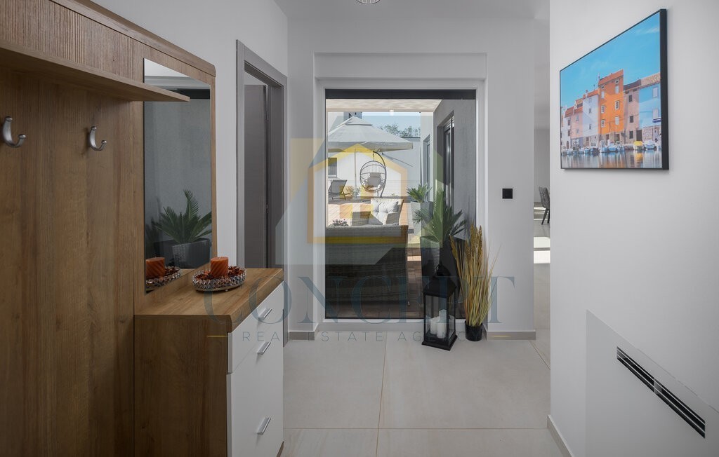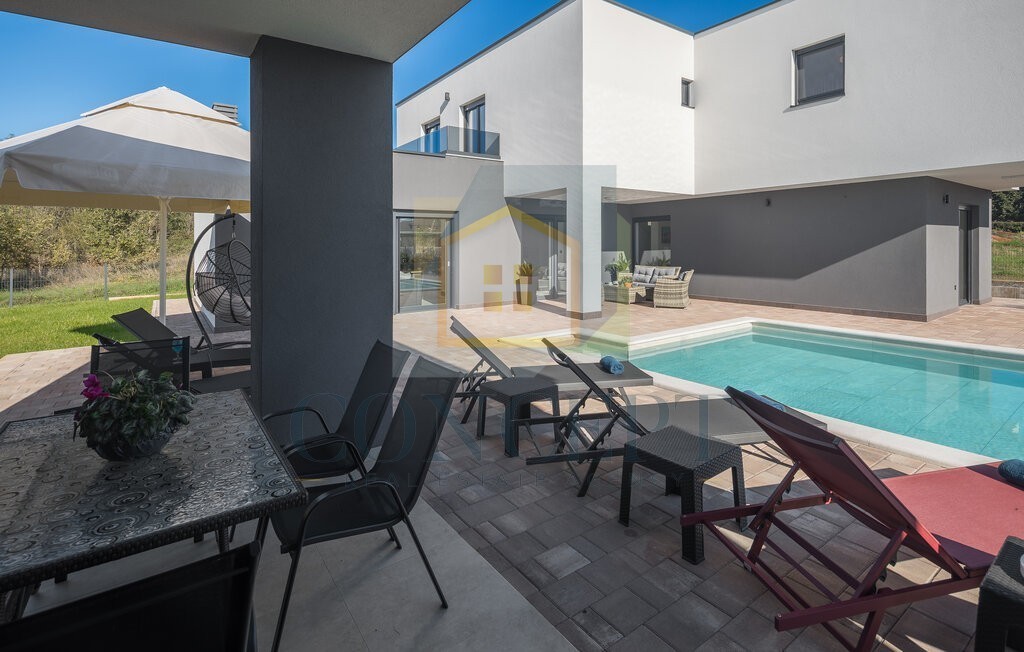 Prodaje se kuća u novogradnji u mirnoj okolici Poreča, udaljena 12 km od mora i grada. Smještena je na zemljištu površine 766 m², a prostire se na dvije etaže s ukupno 214 m² stambenog prostora.