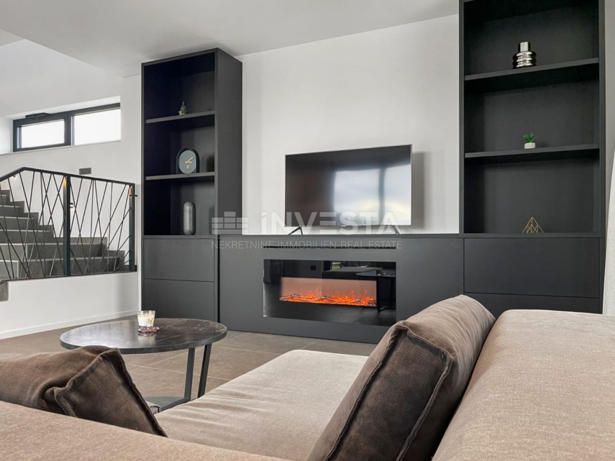 U prizemlju se smjestio prostrani dnevni boravak sa izlazom na terasu, kuhinja i blagovaonica po open space konceptu, jedna spavaća soba sa kupaonicom te izlazom u zonu vrta. Također se u prizemlju smjestila natkrivena ljetna kuhinja sa toaletom, bazen površine 50 m² sa sunčalištem, wellness sa saunom te praonicom. Unutarnjim stubištem dolazimo na kat gdje su se smjestile tri spavaće sobe, svaka sa svojom kupaonicom, dok jedna soba ima izlaz na terasu gdje je smješten jacuzzi te se pruža predivan pogled na morsko plavetnilo.