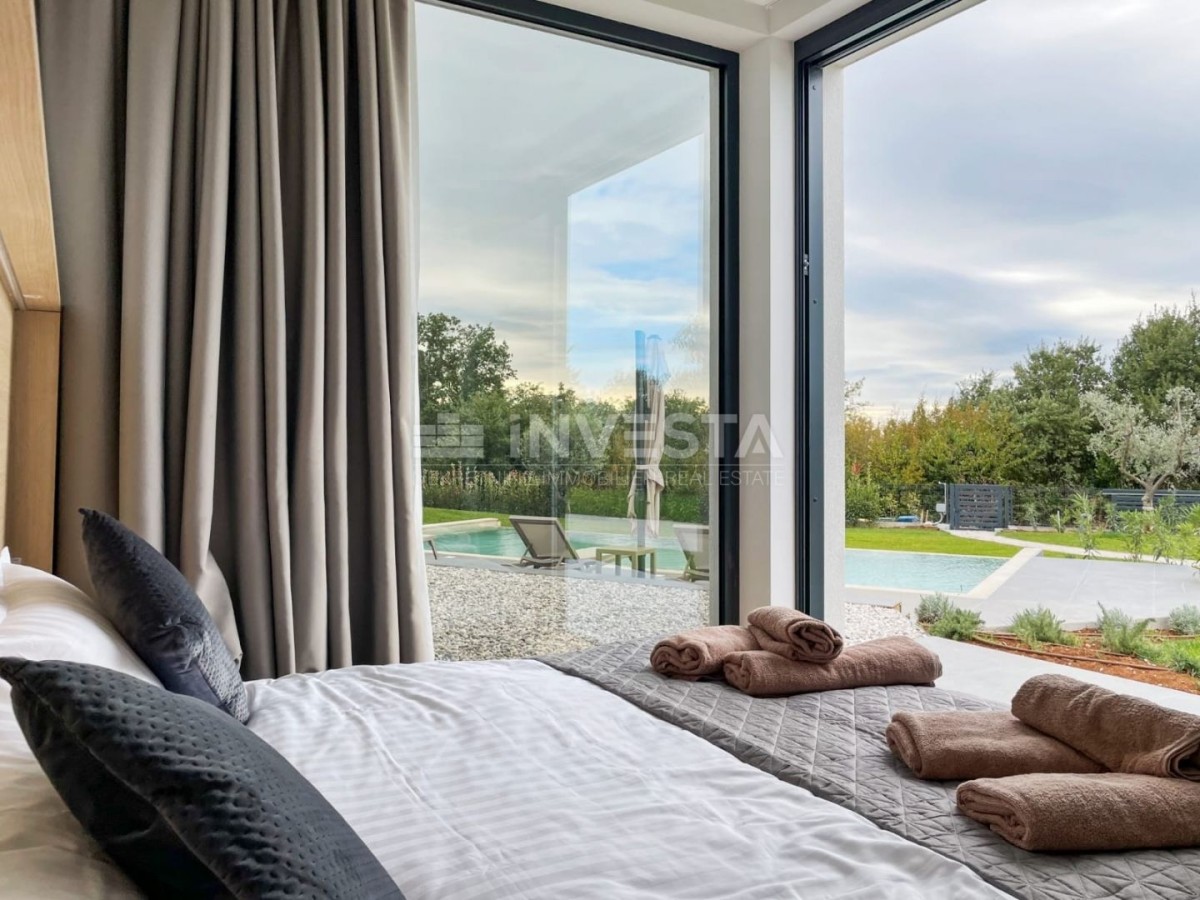 Lokacija: Sama mikro lokacija ove vile je posebna jer se smjestila na rubu građevinske zone, okružena maslinicima i prekrasnim pogledom na prirodu i mir osiguravajući vlasnicima maksimalnu privatnost.