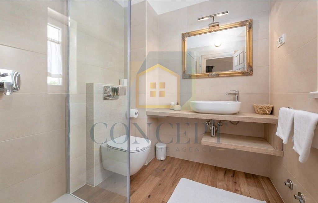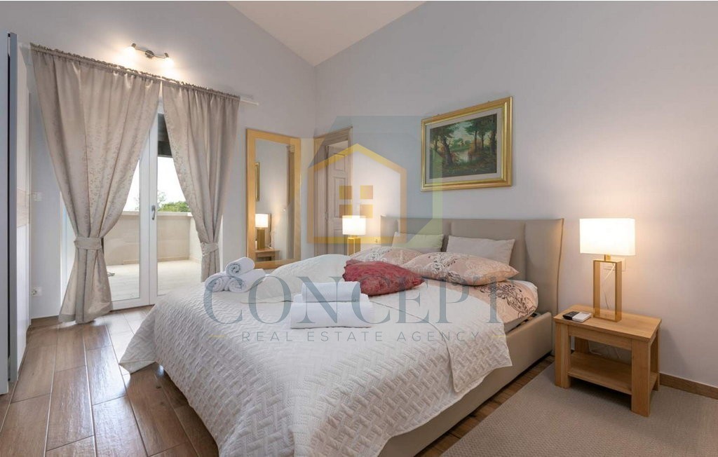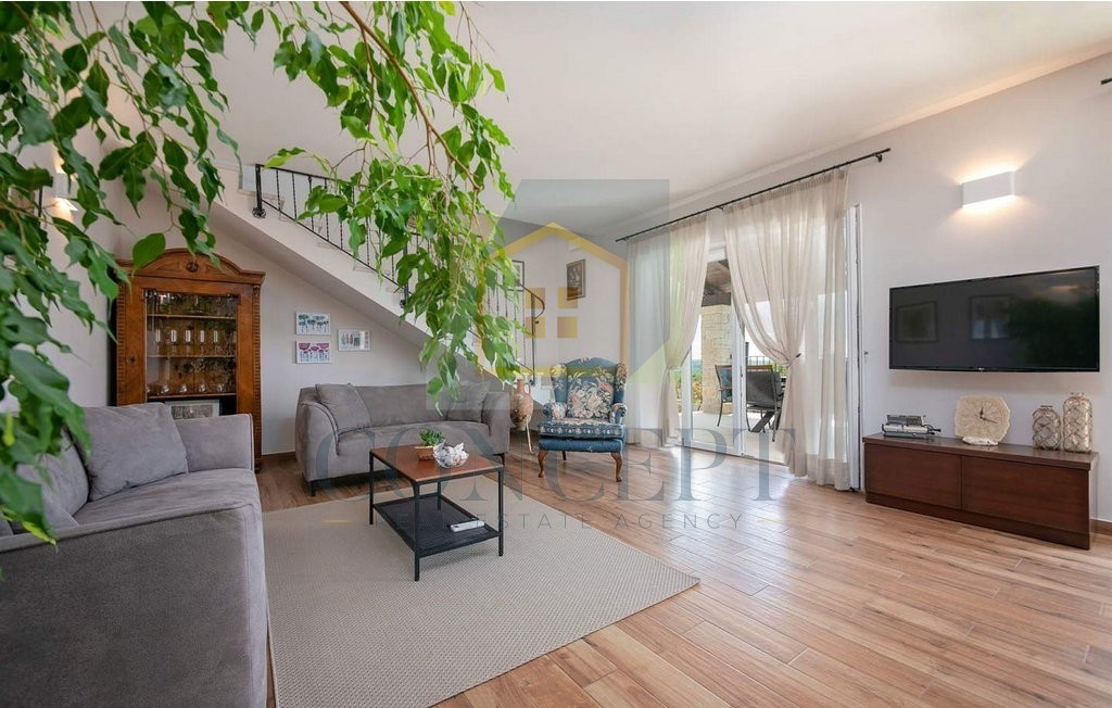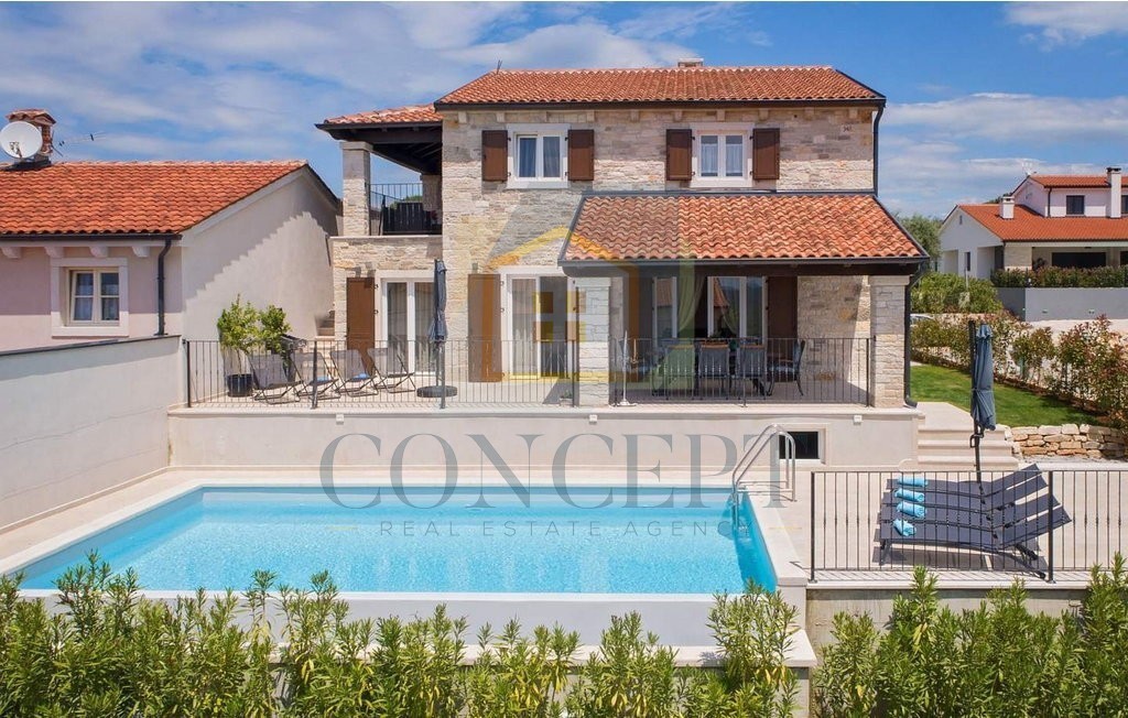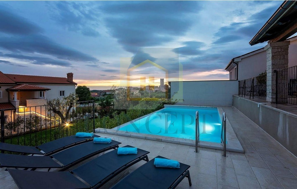 U okolici Poreča, na povišenoj i mirnoj lokaciji, prodaje se vila uređena kombinacijom klasičnih i modernih detalja, s panoramskim pogledom na prirodu i more. Vila je smještena na potpuno ograđenom zemljištu površine 562 m², a ukupna stambena površina iznosi 355 m², raspoređena na tri etaže. Izgrađena je 2018. godine.