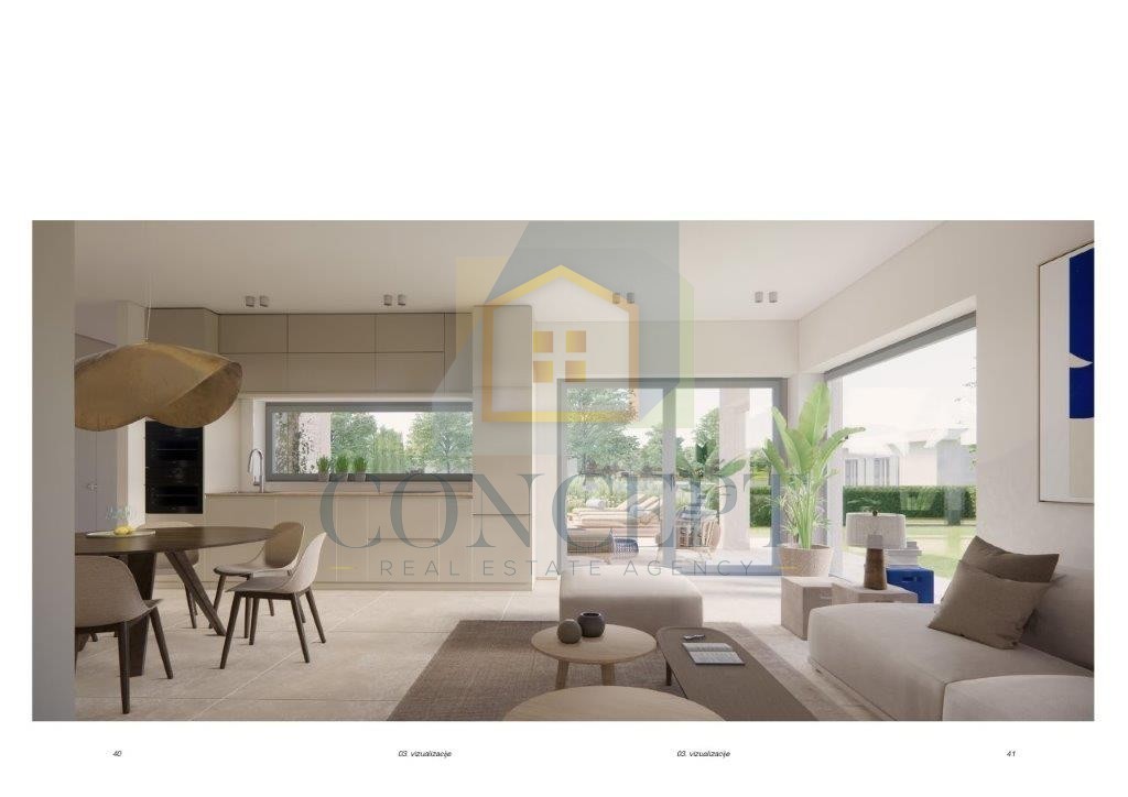 Ukupna stambena površina kuće iznosi 101,45 m². Kuća ima hodnik, otvoreni prostor kuhinje, blagovaonice i dnevnog boravka s mnogo prirodnog svjetla, iz kojeg se izlazi na veliku terasu od 20 m² pogodnu za opuštanje ili objedovanje. U dvorištu se nalazi grijani bazen.
