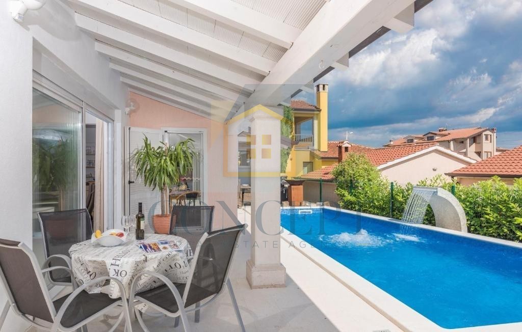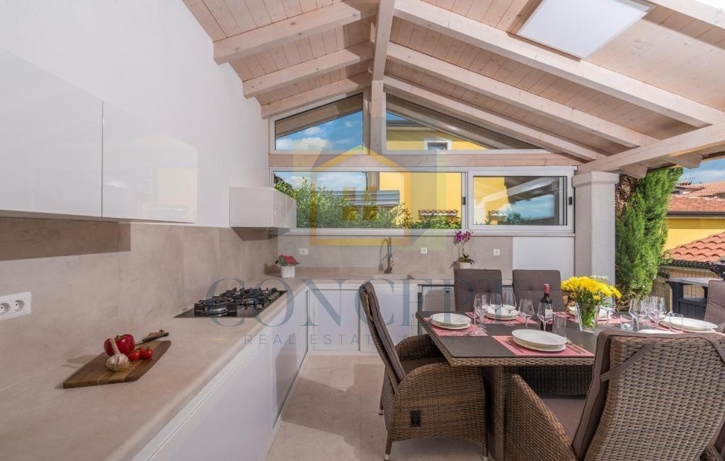 U vanjskom dijelu nekretnine nalazi se grijani bazen sa slanom vodom površine 28 m² , sunčalište te natkrivena ljetna kuhinja s roštiljem – idealna za boravak i pripremu obroka na otvorenom.