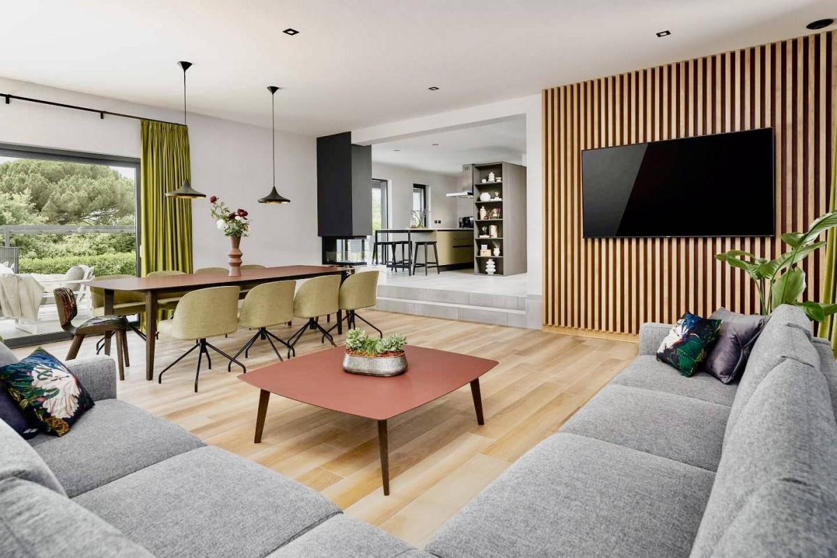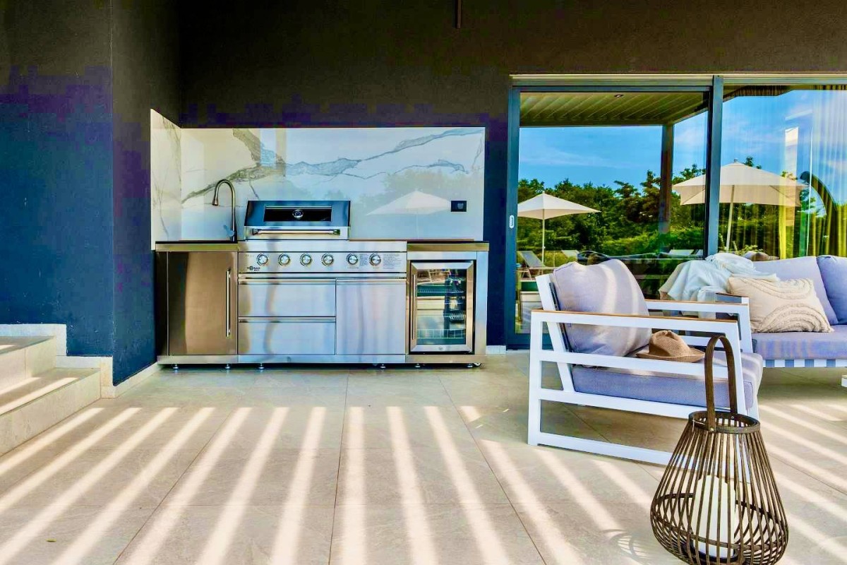 Nekretnina se nalazi na parceli od 950 m2 s bazenom (s hidromasažom), jacuzzijem, vanjskom kuhinjom, natkrivenim dnevnim boravkom i natkrivenom terasom s velikim stolom za blagovanje - besprijekorno povezanom s modernom dizajnerskom kuhinjom.