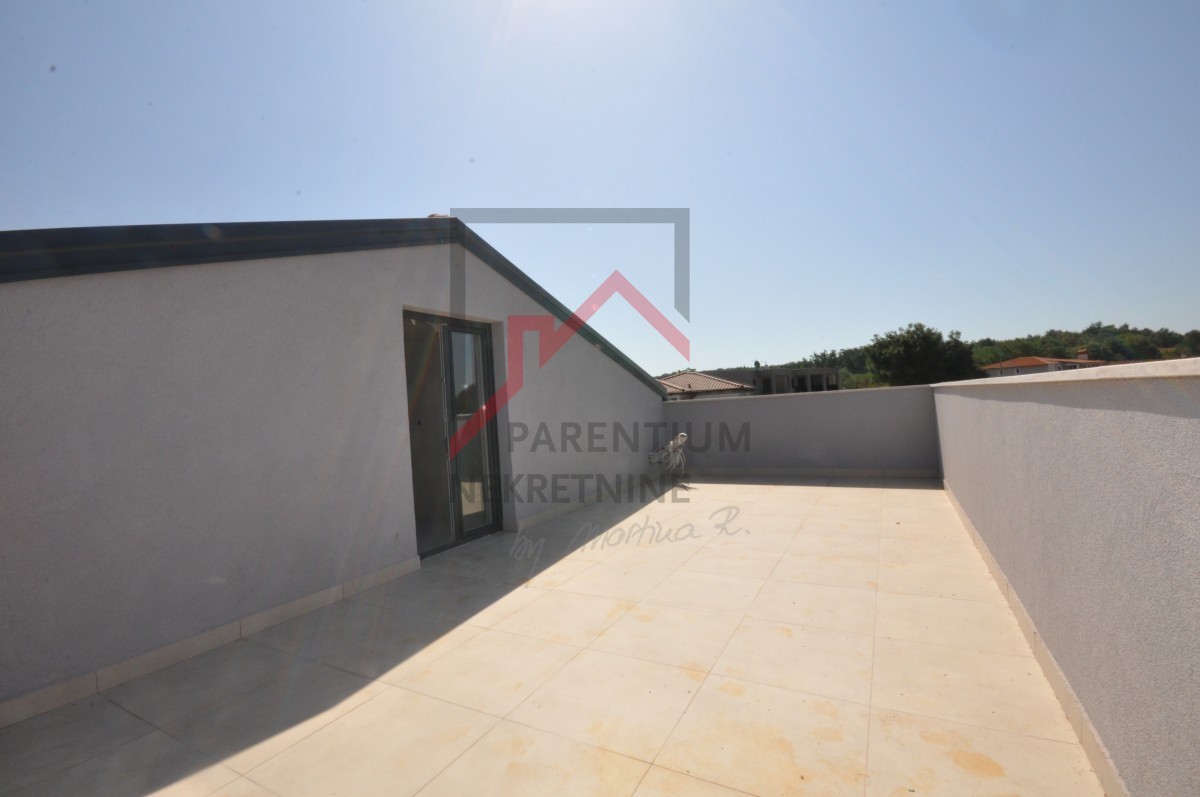 U blizini grada Poreča u zgradi s 5 stanova prodaje se ovaj trosoban stan na prvom katu s terasom. Sastoji se od kuhinje sa blagovaonom i dnevnog boravka , toaleta i spavaće sobe ,unutarnje stepenice vode nas do visokog potkrovlja gdje su smještene još dvije spavaće sobe , kupaona , galerija i prostrana terasa od 31 m2 sa otvorenim pogledom na more. Terasa je sigurno i najveći argument stana, jer na tržištu nema puno takvih nekretnina.