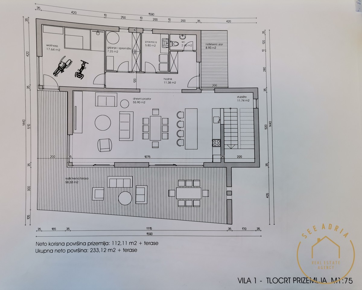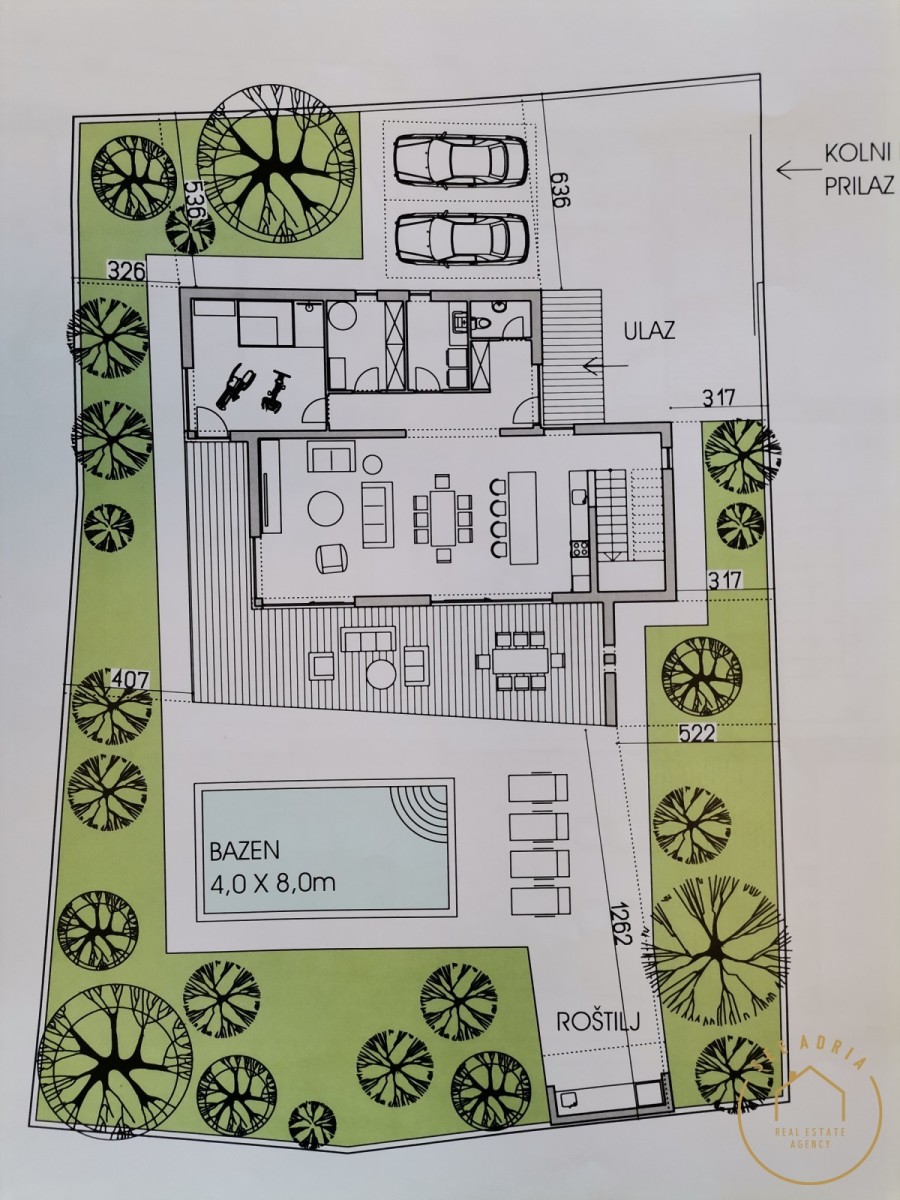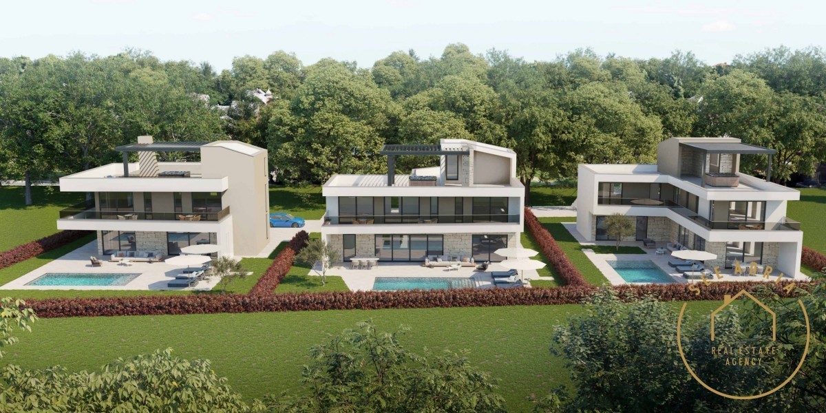 Prodaje se prekrasna moderna vila na 2 etaže u okolici Poreča. Prizemlje se sastoji od prostranog dnevnog boravaka, kuhinje i blagovaonice u "open space" izvedbi od čak 55 m2, wellness-kutka za uživanje, tehničke sobe, praonice i WC-a za goste. Na prvome katu nalaze se četiri en suite spavaće sobe svaka sa svojom kupaonicom i terasa od 58 m2.