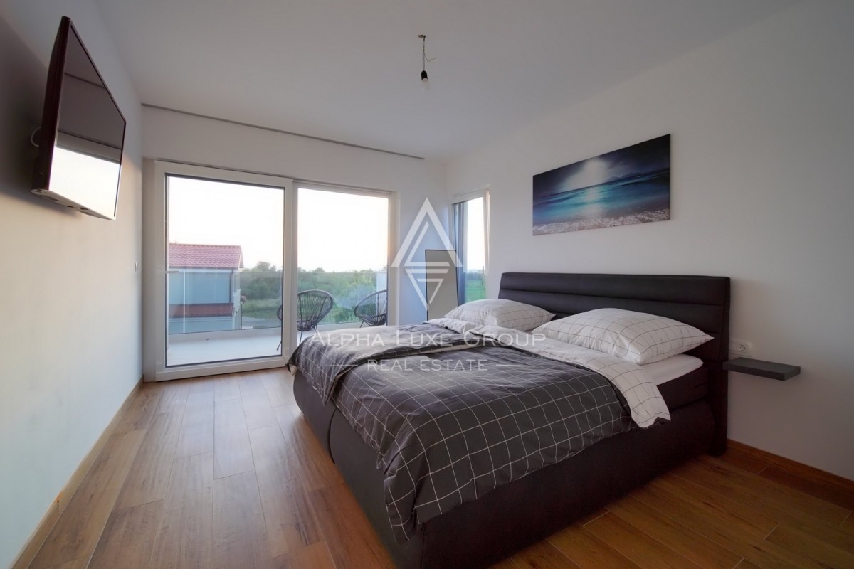Kuća nudi brojne moderne sadržaje uključujući klima uređaje, TV u svim sobama, PVC stolariju s trostrukim ostakljenjem, roletama i komarnicima te podne obloge s keramikom u uzorku drveta. Na raspolaganju je parkiralište za dva vozila, punjač za električno vozilo te ograđena okućnica s panelnom ogradom i vanjskom rasvjetom.