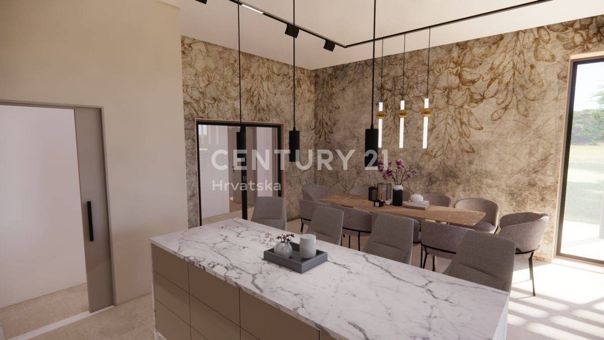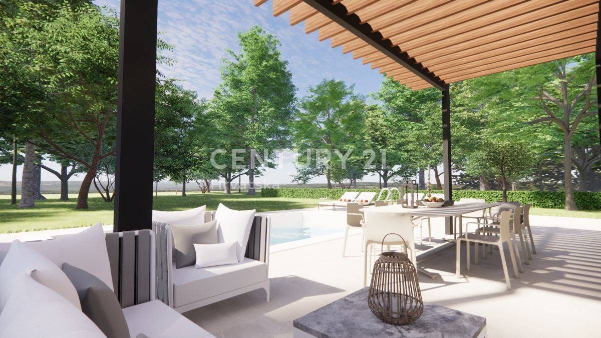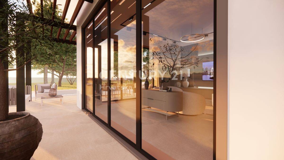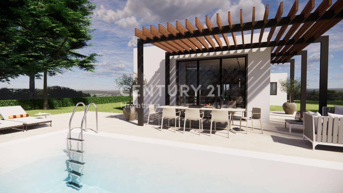 Ova moderna prizemnica plijeni pažnju uređenim okolišem i bazenom od 30m2, a jedna je od 8 vila ovog jedinstvenog projekta.