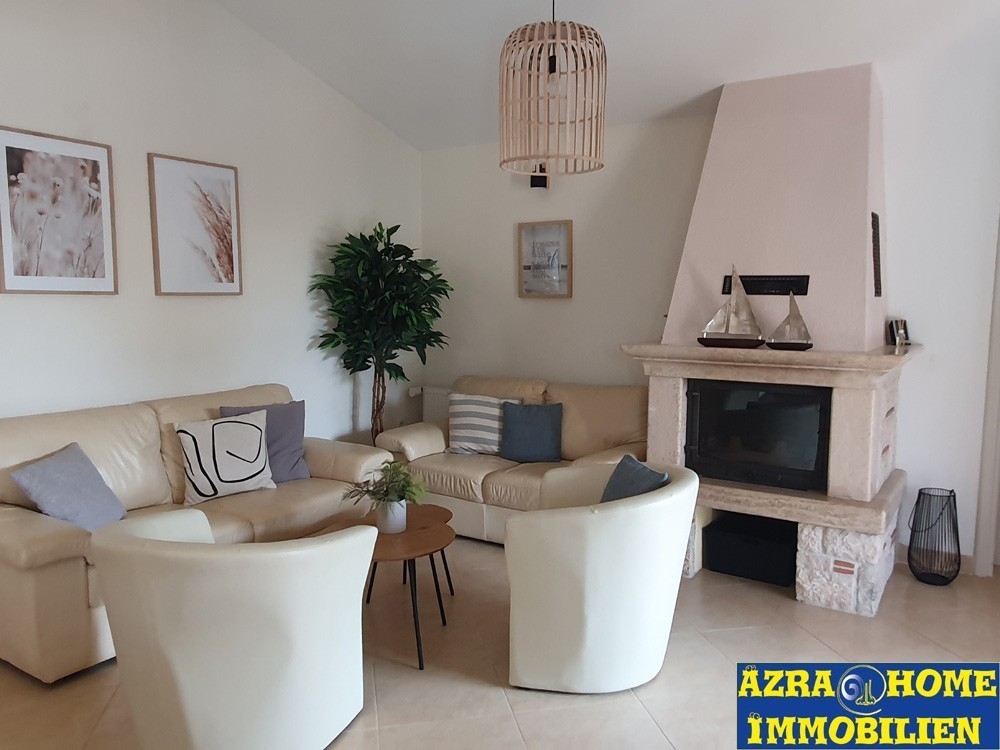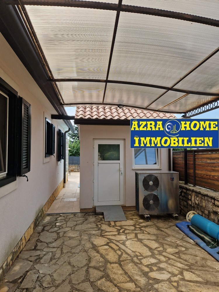 U okolici Tara, na mirnoj lokaciji, 2 km od centra, 5 km od mora, nalazi se ova dvojna kuća, prizemnica. Kuća je građena 2006. g. , vrlo je očuvana , kupatila su djelomično renovirana 2023. g. Kuća ima površinu 101 m2 a sastoji se od: hodnik, tri spavaće sobe od kojih jedna ima vlastito kupatilo, kupatilo, kuhinja , trpezarija i dnevni boravak sa otvorenim kaminom. Iz kuhinje i dnevnog boravka izlazi se na veliku terasu na južnoj strani. Ispred ulaza u kuću , zasebna je prstorija gdje je spremište i vešeraj. U dvorištu se nalazi bazen oko 24 m2, strojarnica i spremište