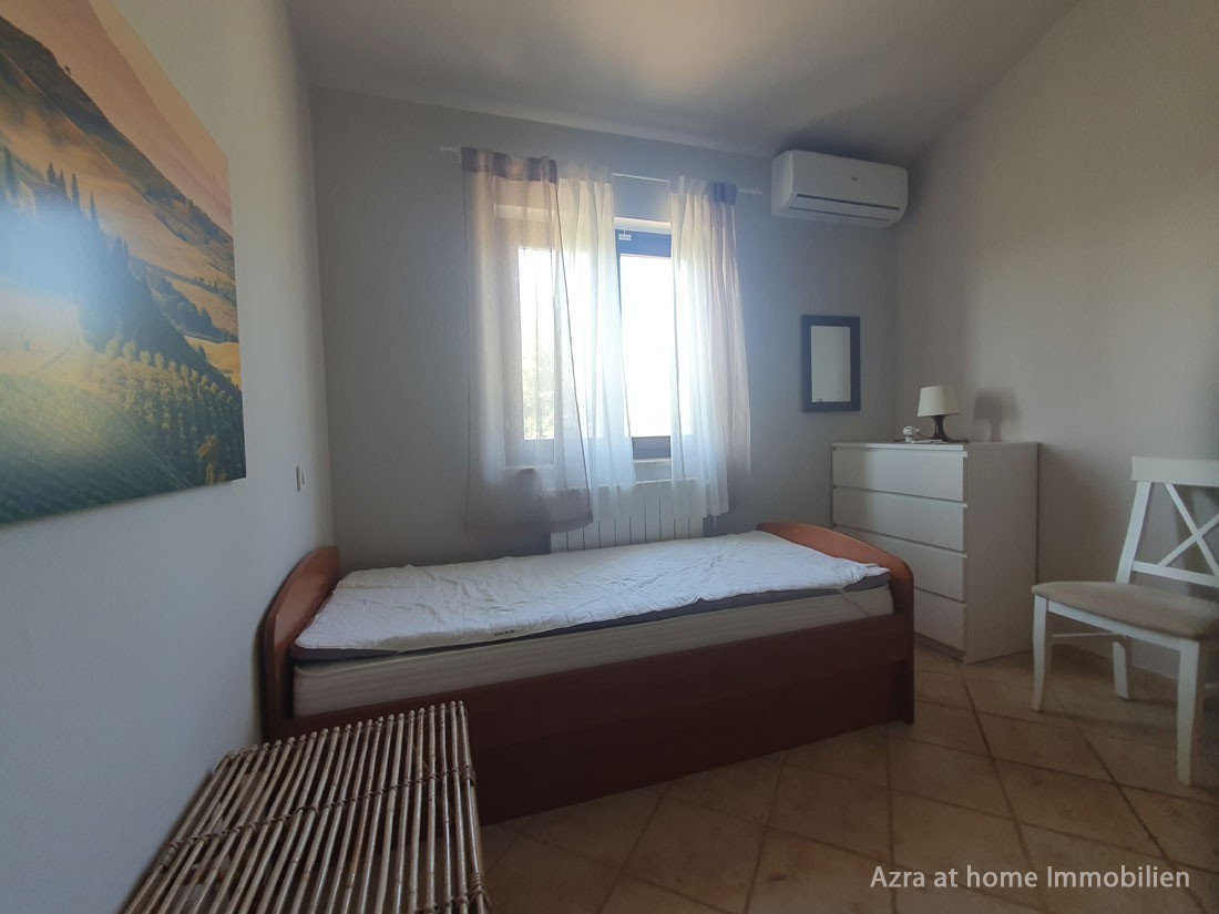 Na ca.6km udaljenosti od mora i Poreča, smještena je ova samostojeća kuća ukupne površine ca.130 m2. Sastoji se od: predsoblja, kotlovnice, dnevnog boravka, kuhinje sa malom ostavom i blagovaonice, spavaće sobe sa vlastitom kupaonicom, hodnika, dvije spavaće sobe, kupaonice i terasa sa vanjskim kaminom / roštiljem. Na uređenom zemljištu površine ca.859m2 smješten je i bazen. Kuća je klimatizirana, ima centralno grijanje i prodaje se namještena. Djelomičan pogled na more.