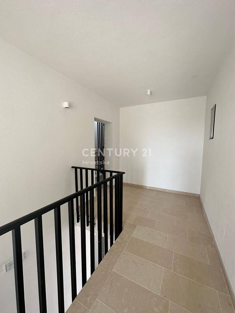 Unutarnjim stepeništem stižemo na 2 kat gdje se nalaze još dvije spavaće sobe, zajednička kupaonica, prostrani dnevni boravak sa kuhinjom i blagovaonicom otvorenog tipa iz kojeg se izlazi natkrivenu terasu površine 21 m2 sa koje se pruža otvoren pogledom na more.