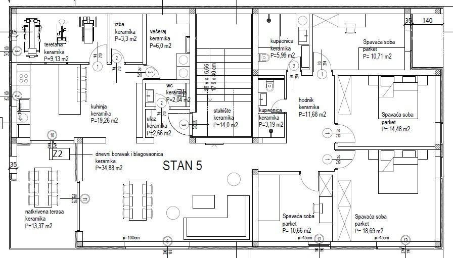 Stan A5, 166.04 m2, nalazi se na drugom katu zgrade i sastoji se od sljedećih prostorija: