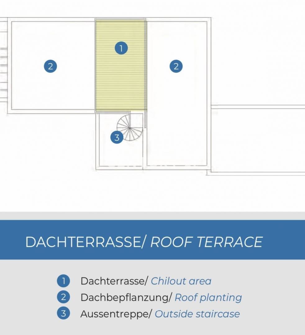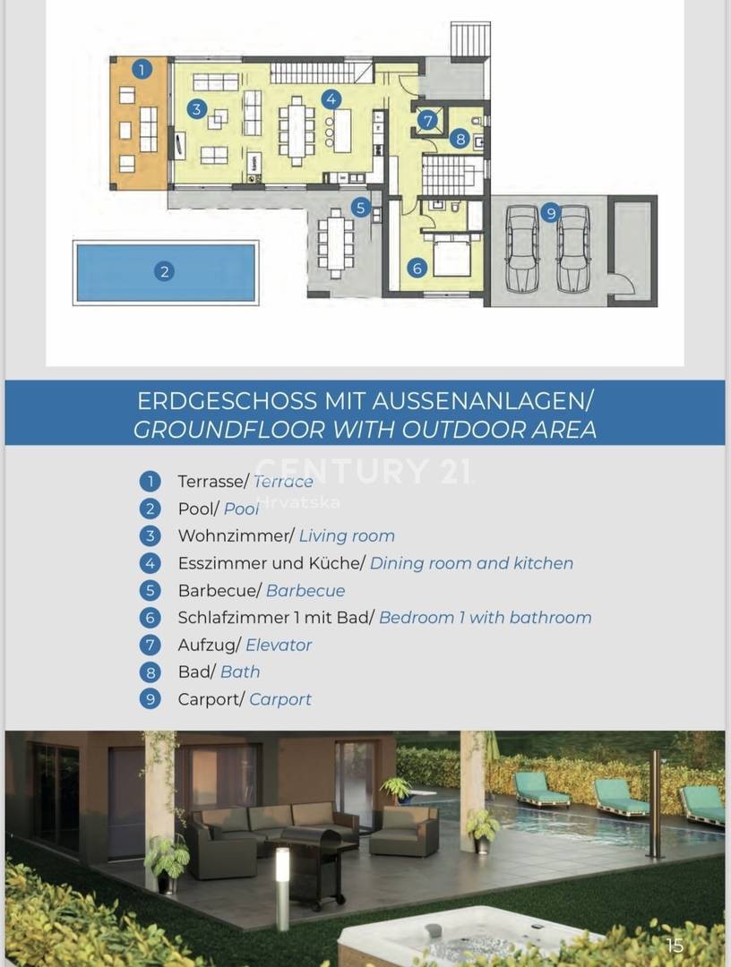 Prizemlje projekta sastoji se od ulaznog hodnika, kuhinje sa blagavaonom i dnevnim boravkom otvorenog tipa, kupaaonice, jedne spavaće sobe, vanjske ljetne kuhinje sa kaminom, sunčališta i bazena, te lift ali i unutarnje stepenište kojim se penjemo na 1.kat.