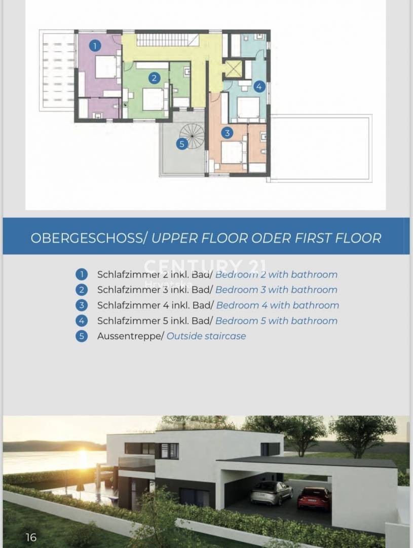 Projekt na prvok katu ima hodnik/komunikaciju, četiri prostrane i komforne spavaće sobe svaka sa svojom kupaonicom, i unutarnje stepenište kojim se penjemo na krovnu terasu koja će biti osmišljena kao zona za sunčanje i opuštanje.