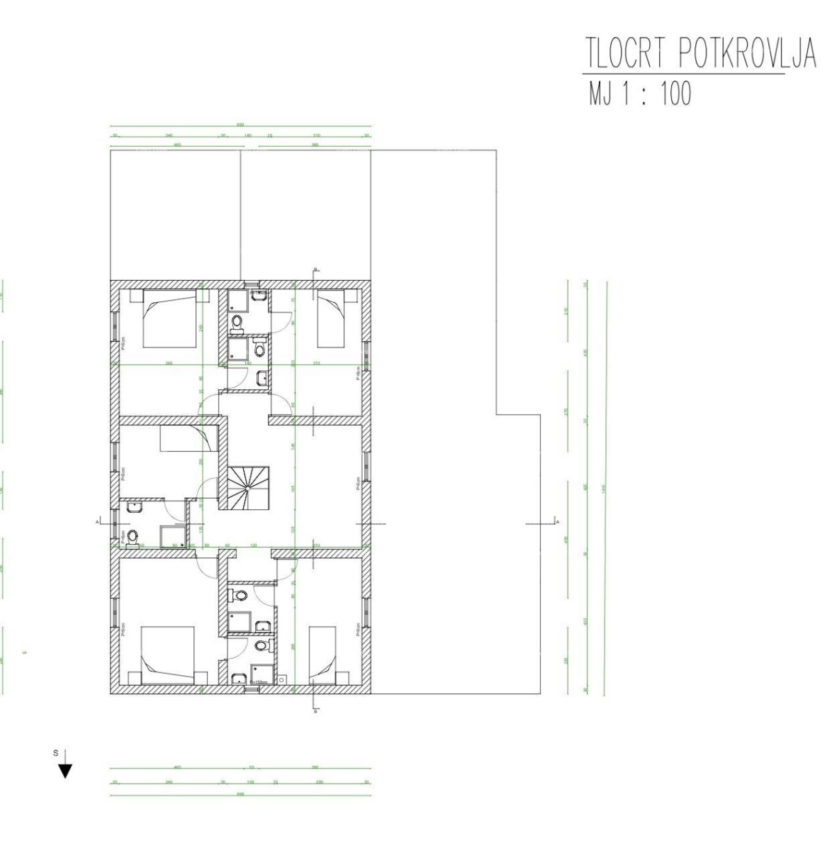 U potkrovlju se nalazi 5 spavaćih soba i 5 kupaona sa tuš kabinama.