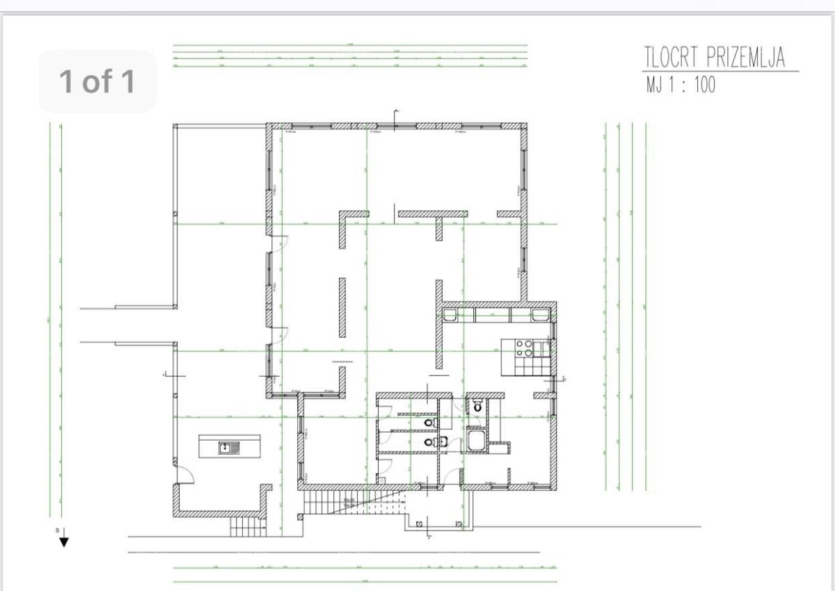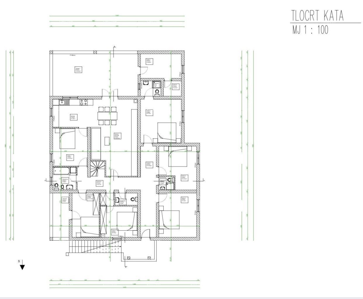 Prvi kat se sastoji od dnevnog boravka sa kuhinjom i blagavaonom, 6 spavaćih soba+ 2 dodatne sobe, 4 kupaone, 2 hodnika i dvije terase.
