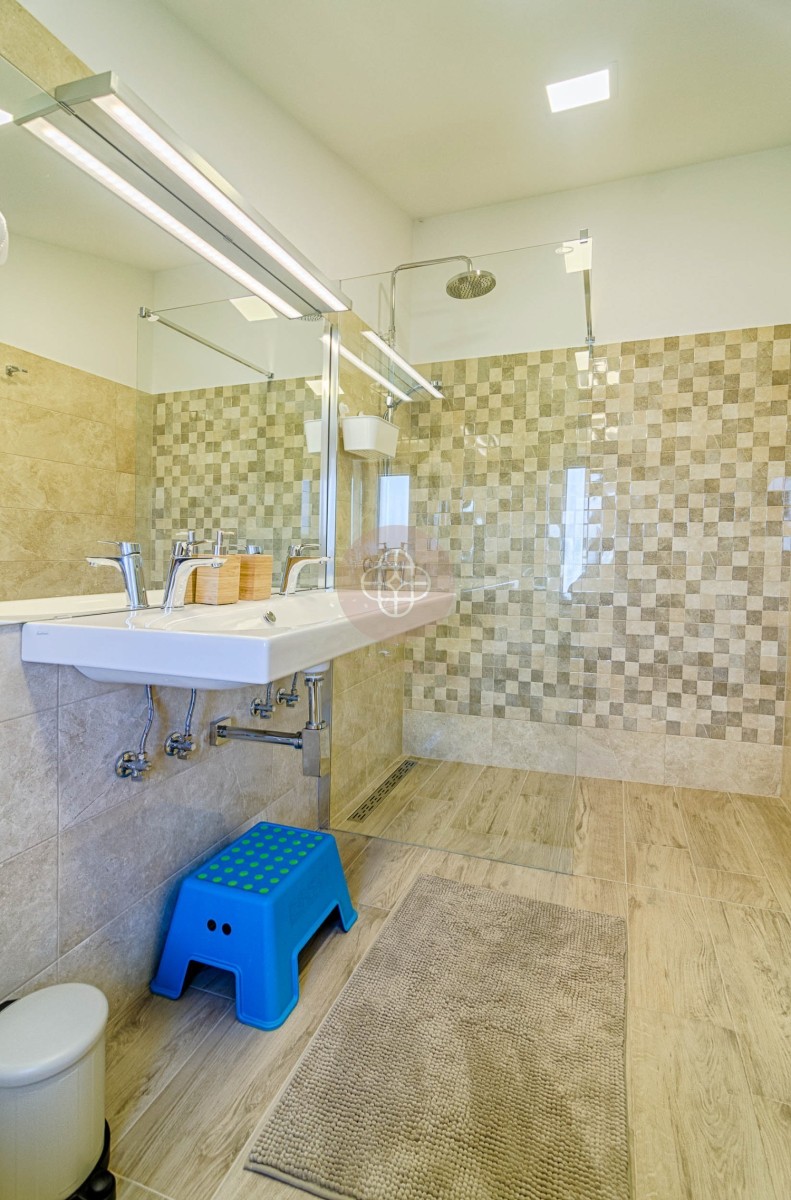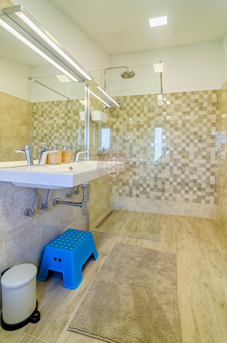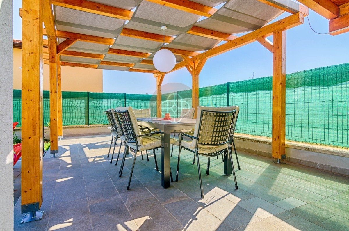 Ulaskom u prostrani vrt privlače bujno zelenilo i dobrodošle značajke. Blještavi bazen pruža osvježenje od ljetne vrućine, dok vanjska kuhinja pruža savršen okvir za obroke na otvorenom. Za obitelji s djecom, vlastito igralište osigurava beskonačne sate zabave. Osim toga, vrt je opremljen vlastitim sustavom za navodnjavanje koji osigurava da se bujna krajolika održava živahnom tijekom godišnjih doba. Kako bi zadovoljili stanare i goste, iza imanja nalazi se dovoljno parkirnih mjesta za do četiri vozila.