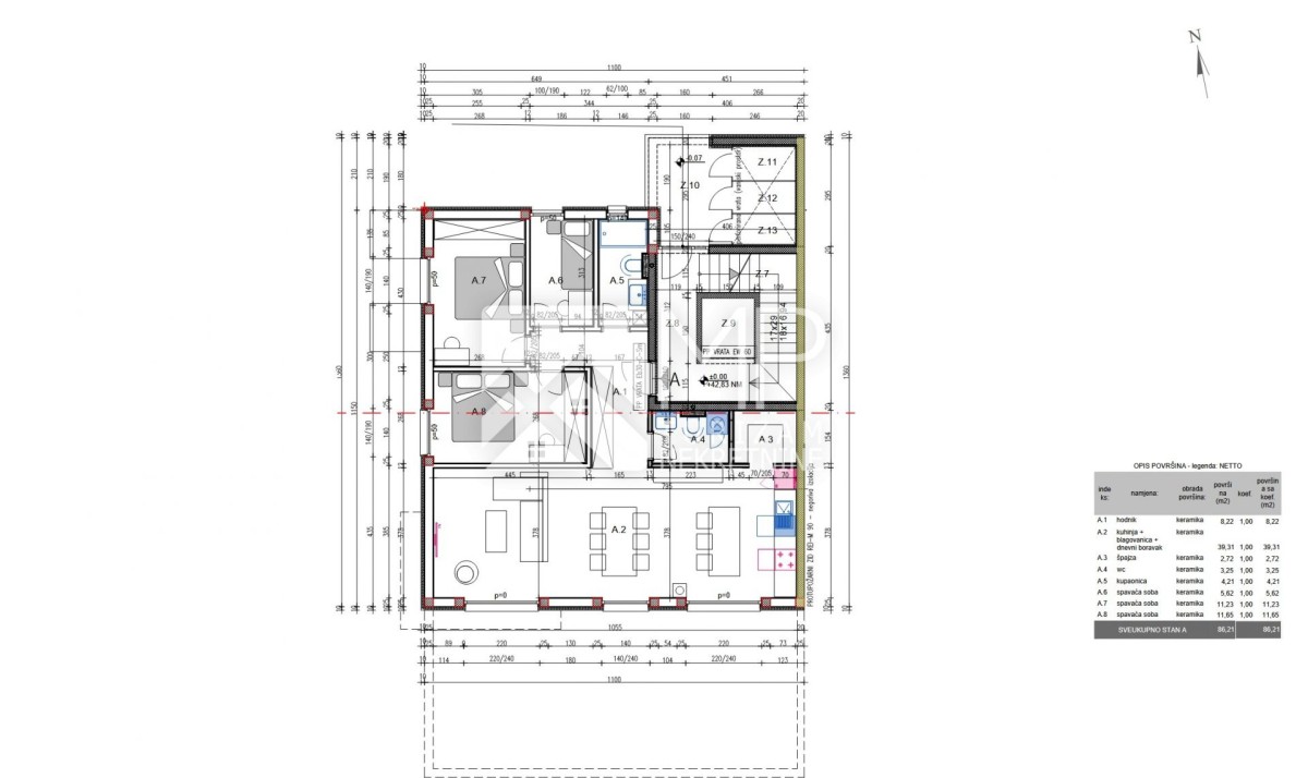 Stan ukupne stambene površine 86,21 m² sastoji se od ulaznog hodnika (8,22 m²), prostrane kuhinje s blagovaonicom i dnevnim boravkom (39,31 m²), špajze (2,72 m²), zasebnog WC-a (2,35 m²), kupaonice (4,01 m²) te tri spavaće sobe površina 5,62 m², 11,65 m² i 12,33 m².