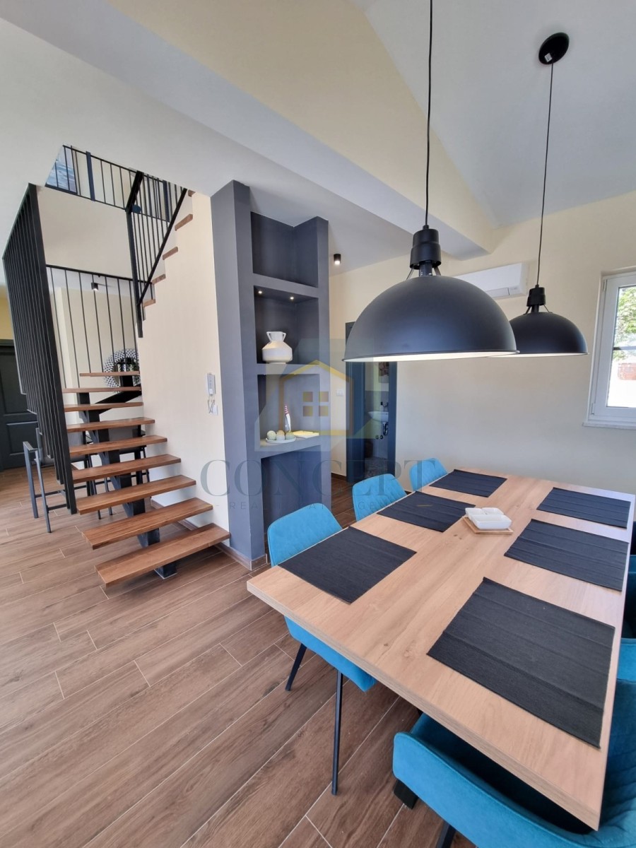 Unutarnje stubište s drvenim gazištima od hrasta vodi na kat, gdje se nalazi dodatna spavaća soba s terasom, pogledom na more i okolicu te vlastitom prostranom kupaonicom.