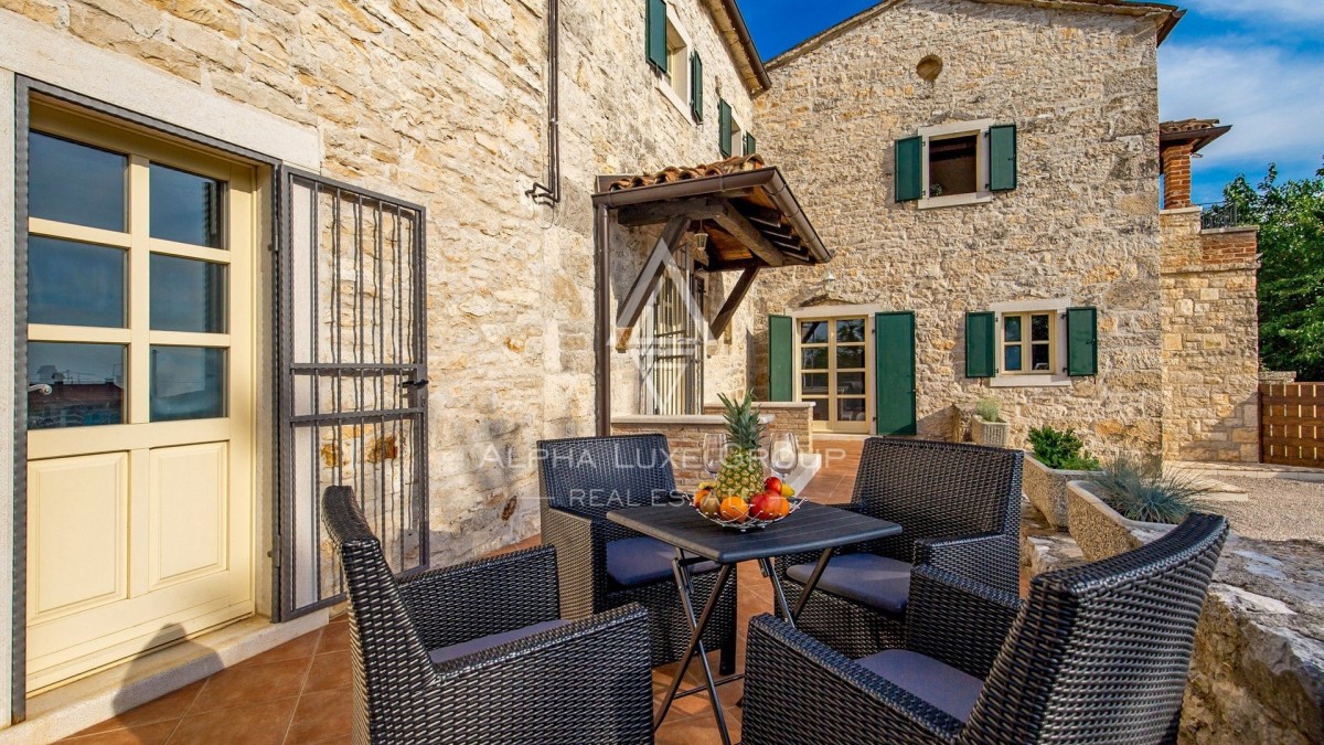Kamena kuća stambene površine 300 m2 na potpuno uređenoj i ograđenoj okućnici od 700 m2, sa bazenom od 32 m2 sa sunčalištem.