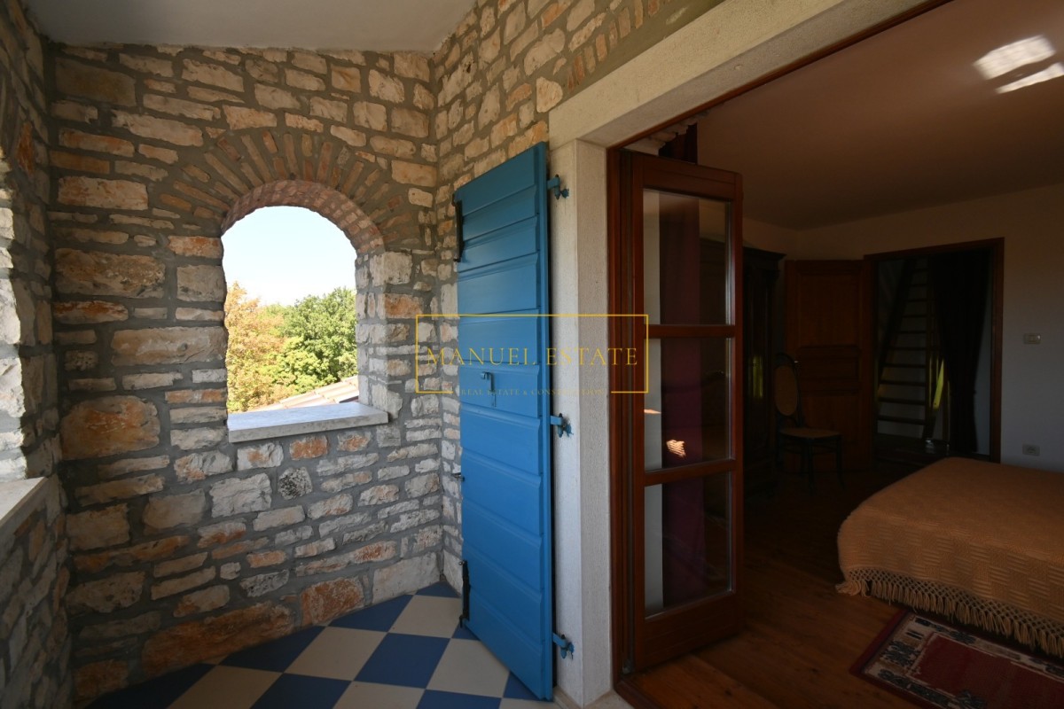 Predivna samoodrživa kamena kuća u šumi, prava oaza mira, jednostavno savršeno prirodno imanje za sve one koji traže bijeg od svakodnevnice, užurbanog tempa života, stresa i buke. Idealna prilika za novi dom ili kao dobra investicija za iznajmljivanje preko cijele godine. Ukupne stambene površine od 167 m2 na terenu od 4.348 m2. Raspoređena je na prizemlje, dva kata i potkrovlje. U prizemlju se nalazi konoba s kaminom i kuhinjom, te ostava. Veliki kamin je centralno povezan s cijelom kućom, te služi za grijanje. Prvi kat se sastoji od dnevnog boravka, kuhinje s blagovaonicom, te terase s baladurima. U dnevnom boravku se nalazi još jedan dodatni kamin, koji je povezan sa spavaćim sobama, te služi za grijanje. Drugi kat čine dvije spavaće sobe, kupaonica i terasa. U potkrovlju se nalazi jedna mala radna soba i terasa s prekrasnim neometanim panoramskim pogledom na more i prirodu. U dvorištu se nalazi parking, ostava i natkrivena drvarnica. Dvorište je uređeno i ograđeno visokim kamenim zidovima. Pomno uređena okućnica prostire se na čak 4.348 m2, te pruža potpun ugođaj komfora i mira, a opet je nedaleko od mora, centra Poreča te je dobro povezana sa svim istarskim atraktivnim lokacijama. Velika prednost ove tipično istarske kameno-rustikalne kuće je njezina samoodrživost. Kuća ima solarne panele, te je spojena na gradski vodovod. Smještena je u velikoj privatnosti, te se do nje dolazi vožnjom putem kroz šumu. Prvi susjed je na udaljenosti od 600 m. Ovo jedinstveno imanje nalazi se na samo 15 km od povijesne jezgre i centra šarmantnog grada Poreča. Cijena ove predivne smostojeće samoodržive kamene kuće u prirodi je 640.000 eura. Za sve ostale informacije slobodno nas kontaktirajte.