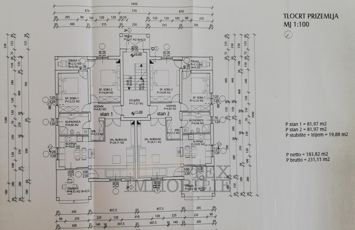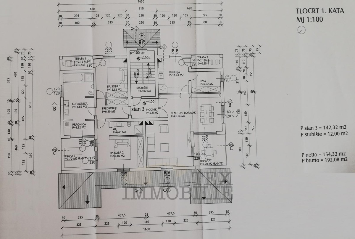Na prvom katu nalazi se prostrani stan preko cijele etaže s velikim dnevnim boravkom, kuhinjom i blagovaonicom, dvije spavaće sobe, dvije kupaonice te čak četiri terase.