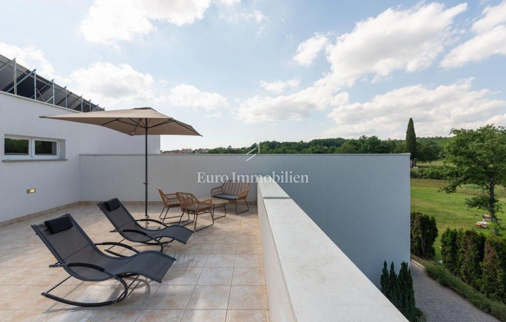 Ova prekrasna villa ima dva bazena, unutarnji i vanjski, te saunu i fitness sobu, jedan dio kuće je uređen kao wellness prostor. Unutarnji bazen je grijani, tako da se bazen može koristiti kroz cijelu godinu. Kuća površine 350 m2 sastoji se od prizemlja i kata. U prizemlju se, osim wellness dijela, nalazi hodnik, spremište, garderoba, WC, garaža, kotlovnica, kuhinja s blagovaonicom, dnevni boravak izlazom na natkrivenu terasu i vrt. Unutarnjim stepenicama se dolazi na kat gdje su smještene četiri spavaće sobe, svaka sa svojim kupaonicama. Dvije sobe imaju i vlastite balkone. Sustav grijanja je putem toplinske pumpe - podno grijanje, u sobama su fen coileri, dok su za toplu vodu instalirani solarni paneli. U vrtu se nalazi nekoliko parkirnih mjesta, malo igralište za djecu, roštilj, travnjak s automatskim navodnjavanjem, mediteransko bilje i vanjski bazen od 40 m2 s terasama. Vrt je ograđen zidom i zelenom ogradom, pa je privatnost zajamčena. Villa je sagrađena je 2014. godine, no renovirana je 2022. godine. Nalazi se u uhodanom turističkom najmu koji je moguće nastaviti.