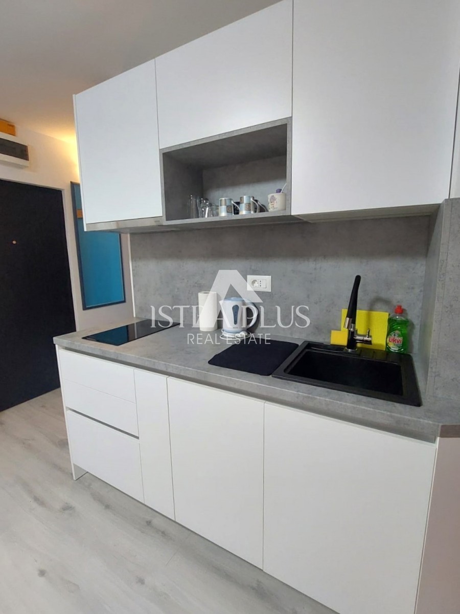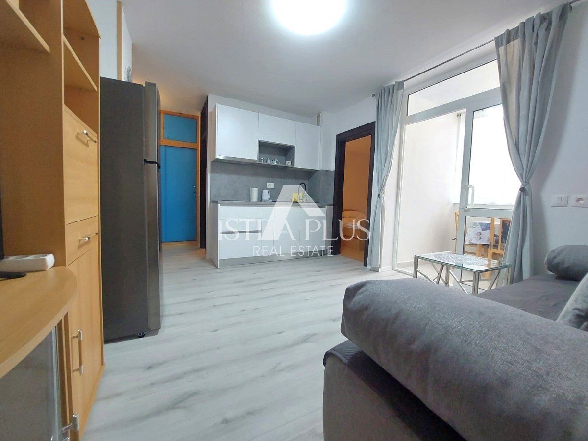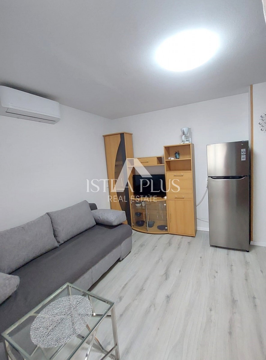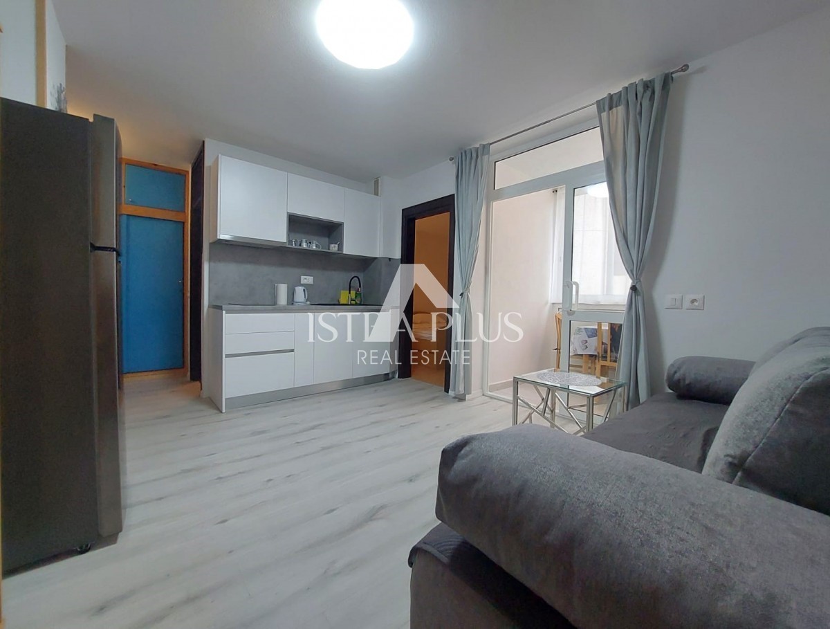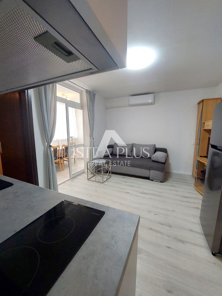 Stan 35m2, sastoji se od spavaće sobe, kupaonice, kuhinje, dnevnog boravka i balkona.