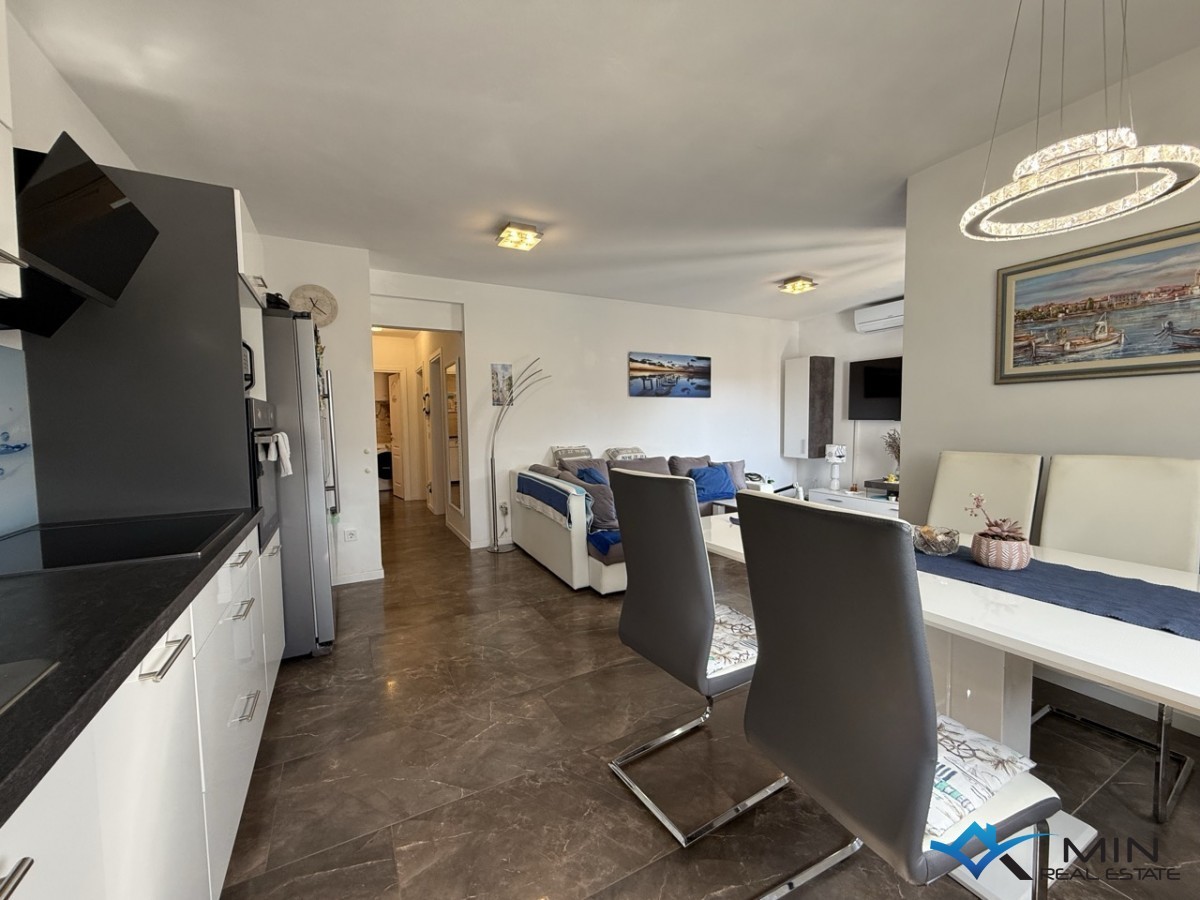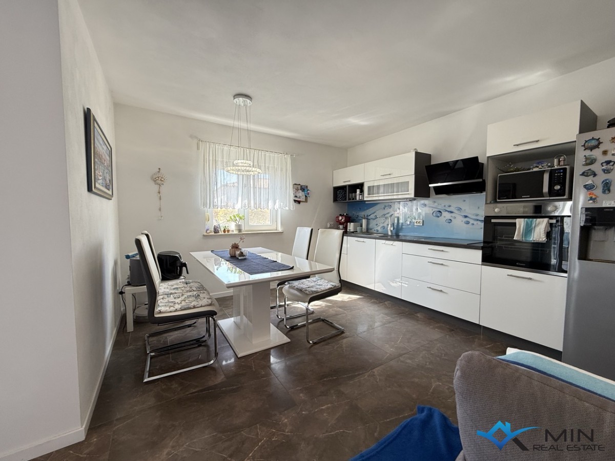 Prodaje se stan na mirnoj lokaciji u Novigradu udaljen 2000 m od mora i lijepo uređene plaže te centra grada. Stan je smješten u prizemlju manje zgrade sa ukupno 4 stana. Stan ima 68 m2 i sastoji se od ulaznog hodnika, spremišta, kupatila, 2 spavaće sobe te open space prostora u kojem su smješteni kuhinja s blagovaonicom i dnevni boravak. Iz dnevnog boravka se kroz staklenu stijenu izlazi na natkrivenu terasu i lijepo uređeni vrt od 130 m2 na kojem je smješten grijani bazen. Grijanje i hlađenje u stanu je putem klima uređaja ( svaka prostorija ima svoju klimu ) i peći na pelete. Stanu pripada 1 parkirno mjesto ispred zgrade.