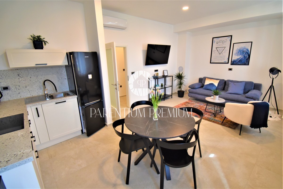 Elegancija i kvaliteta definiraju svaki detalj ovog stana. Talijanska keramika "Marca Corona," PVC stolarija i aluminijske škure, te uključen namještaj čine ovaj dom spremnim za useljenje.