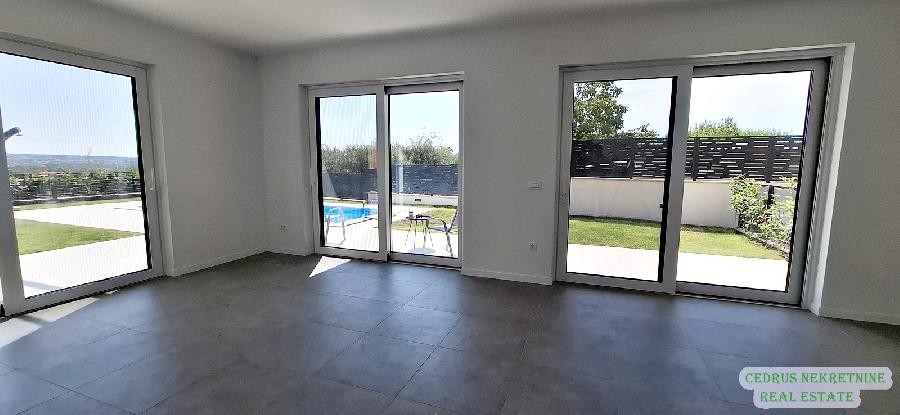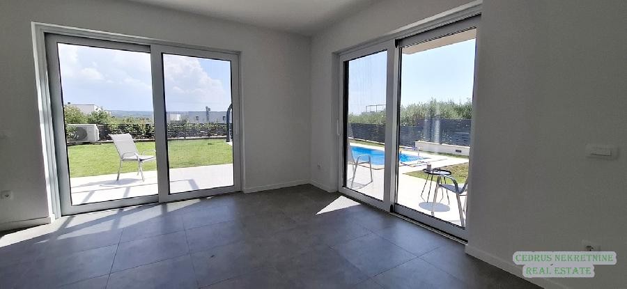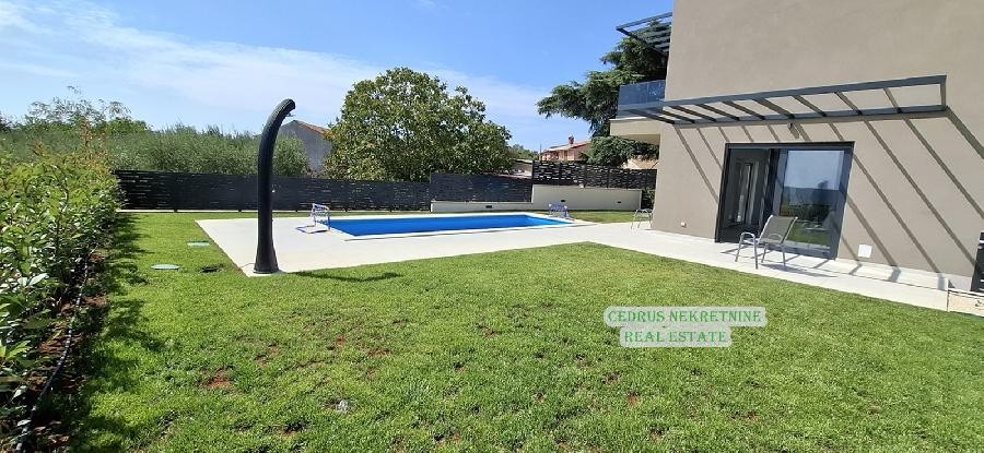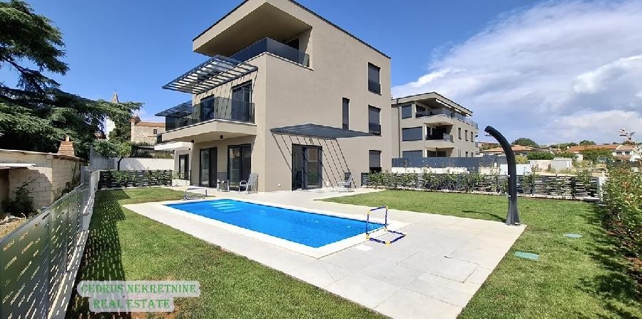 Istra, Tar prodajemo prekrasni dvoetažni stan u novogradnji neto površine 175m2 sa 3 spavaće sobe svaka sa pripadajućom kupaonom. Veliki dnevni boravak sa kuhinjom i blagovaonom sa izlazom na vrtnu terasu sa otvorenim bazenom. U apartmanu je izvedeno podno grijanje u dnevnom boravku i kupaonama, a sve prostorije su opremljene klima uređajima. Bruto površina stana je 342 m2, od toga ukupna korisna površina stana 145 m2, a stanu pripada parkirališno mjesto 12,5 m2, spremište 7,7 m2, dvorišna terasa 52,5 m2, vrt 107 m2 i otvoreni bazen 17,50 m2. Stan je opremljen vrhunskom unutrašnjom i vanjskom stolarijom sa komarnicima i električnim podizačima roleta. Stan se nalazi u novoizgrađenoj zgradi sa ukupno 4 stana. Kupac je oslobođen plaćanja poreza na promet nekretnina. Udaljenost do mora i plaže u St.Marina 2,5km, do Poreča 7km, do aerodroma Pula 75km, do granice sa slovenijom 25km.