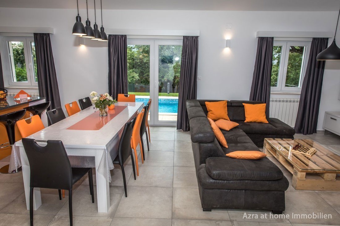Iz kuhinje i dnevnog boravak izlazi se na terasu smještenu uz bazen. U dnevnom boravku je otvoreni kamin. Sve sobe u kući kao i dnevni boravak imaju ugrađene klima uređaje sa sistemo grijanja i hlađenja.