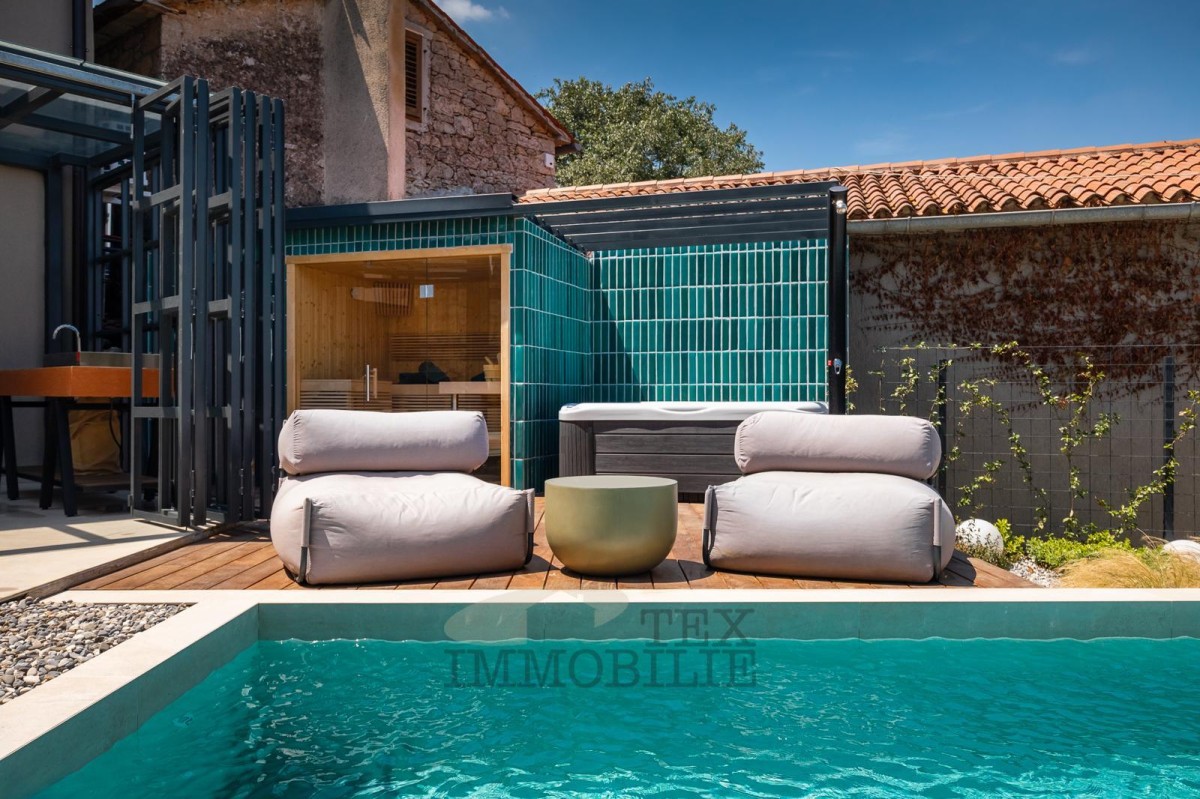 Uz bazen se nalaze sauna, natkriveni whirlpool i tehnička prostorija. Potpuno opremljena ljetna kuhinja s plinskim roštiljem idealna je za druženja, dok se ispod razine bazena nalazi intimni lounge prostor s kaminom/ognjištem, savršen za večernja okupljanja.