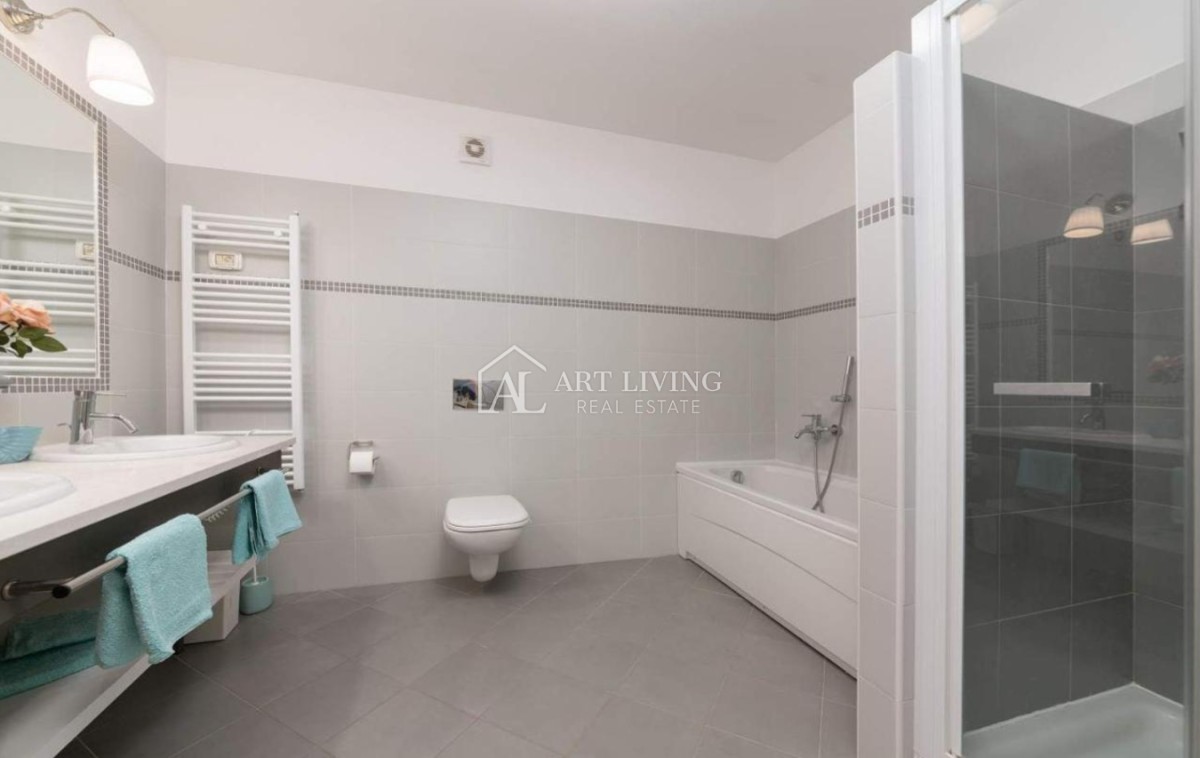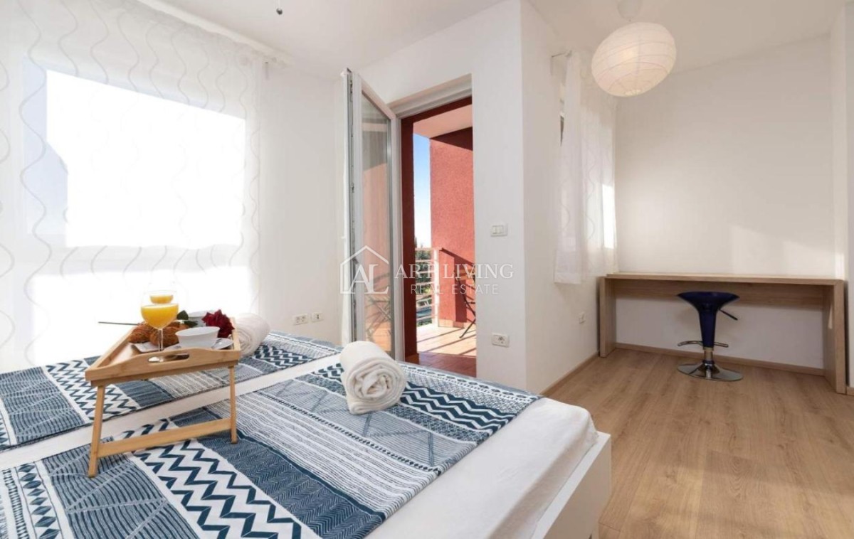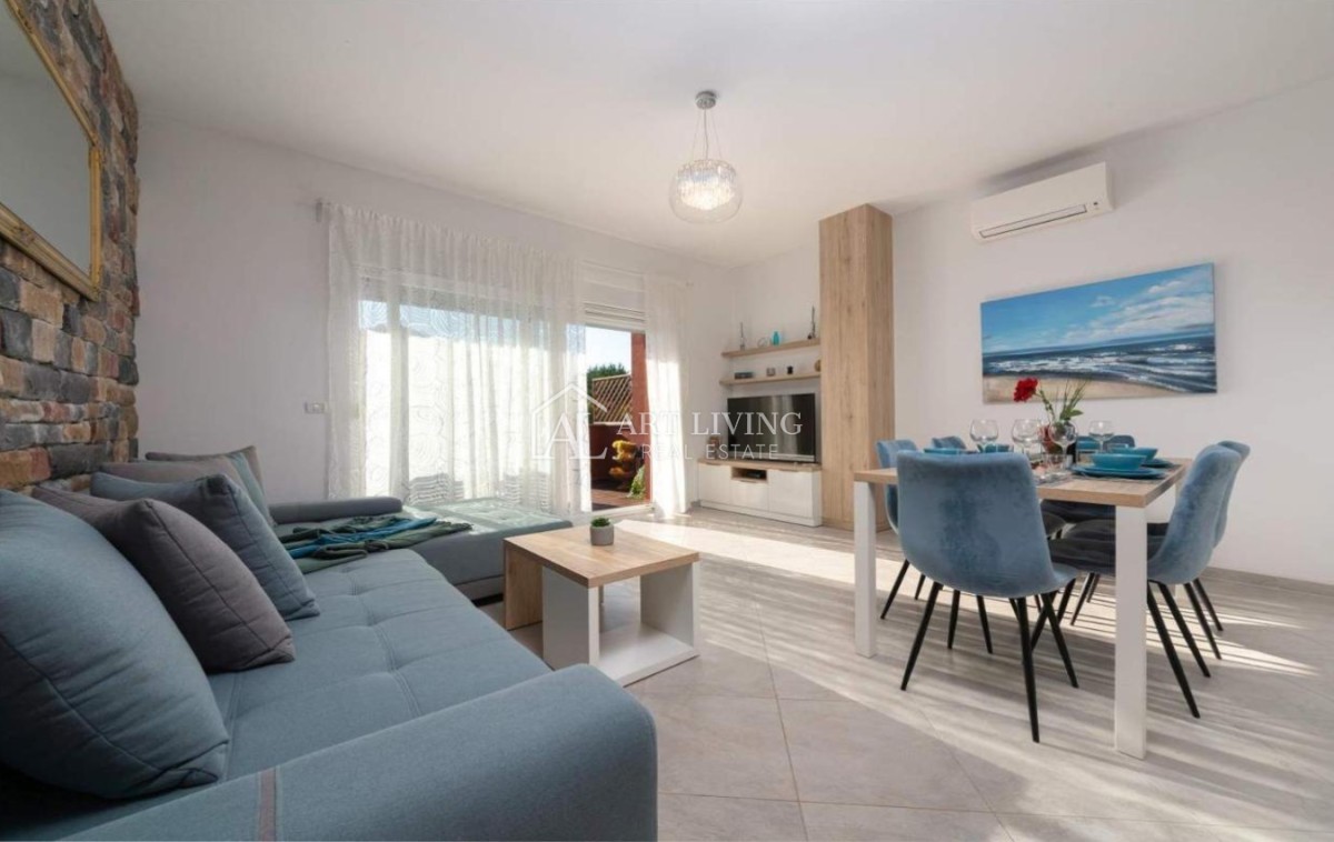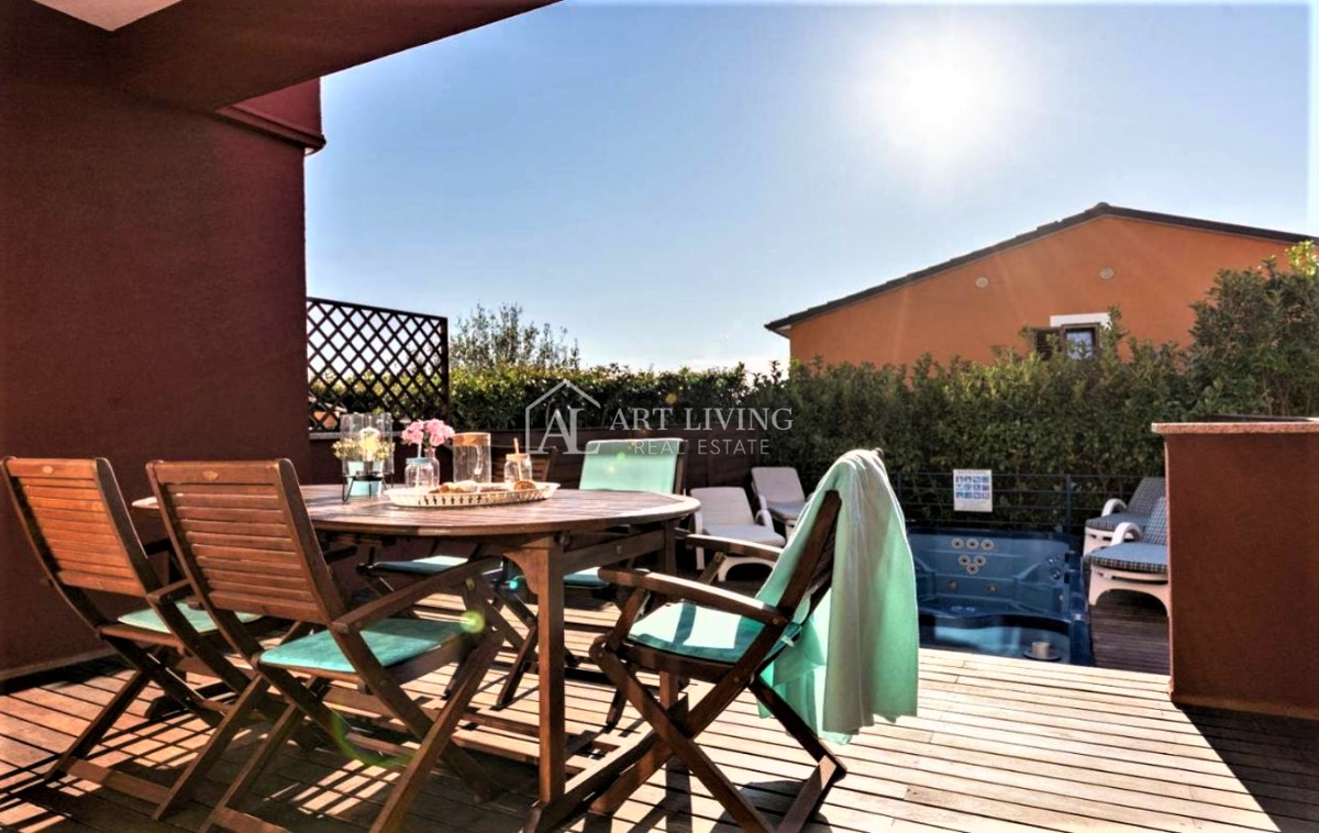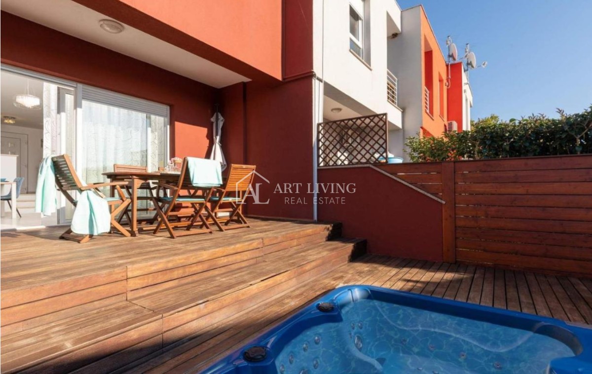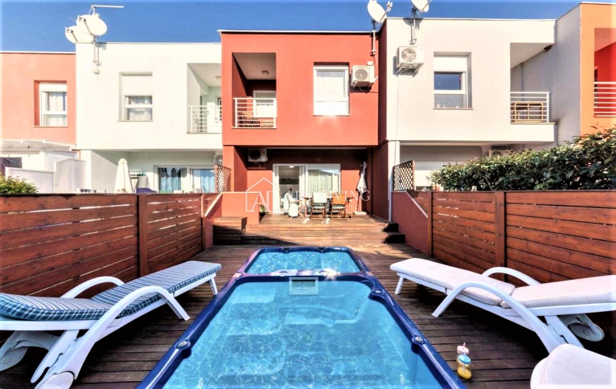 Prodaje se moderna kuća u nizu s bazenom, u mirnom naselju na atraktivnoj lokaciji na samo 2 km od obližnjih plaža Kanegre, golf centra i Kempinski resorta. Udaljenosti od grada Umaga 5 km, Novigrada 20 km od graničnog prijelaza sa Slovenijom 7 km, aerodroma Portorož 10 km i 40 km od zračne luke Trst.