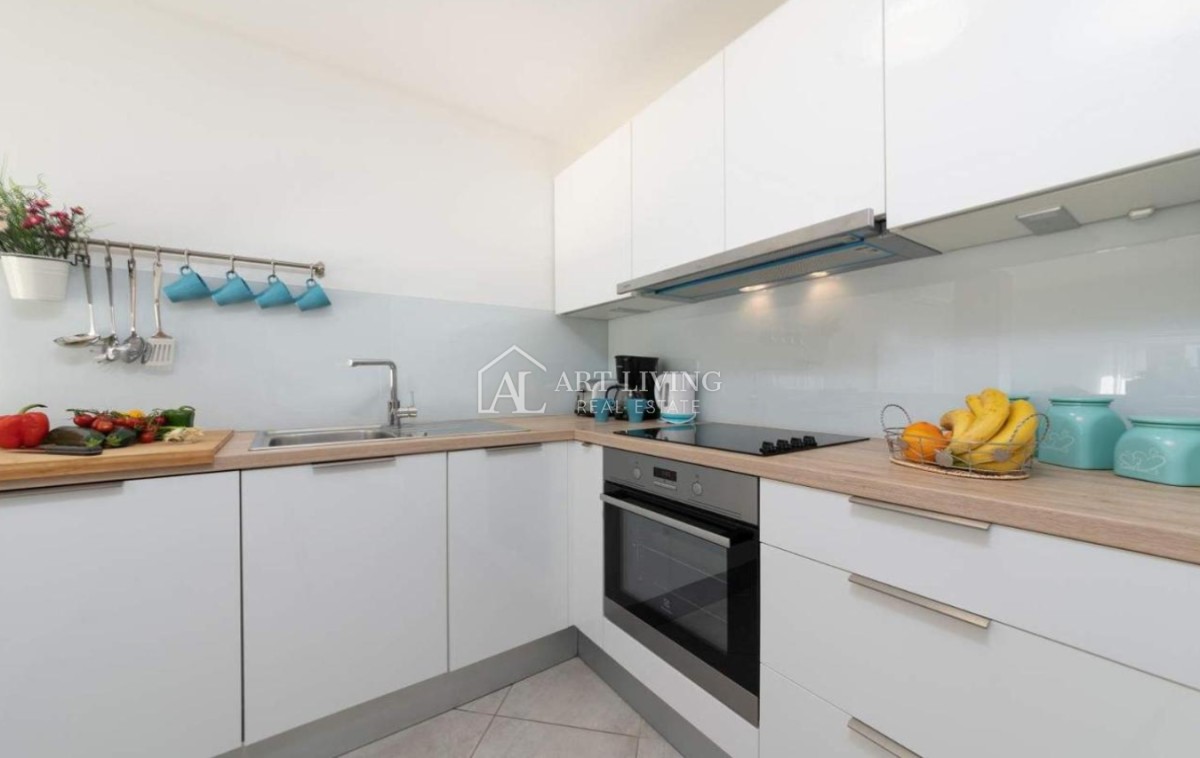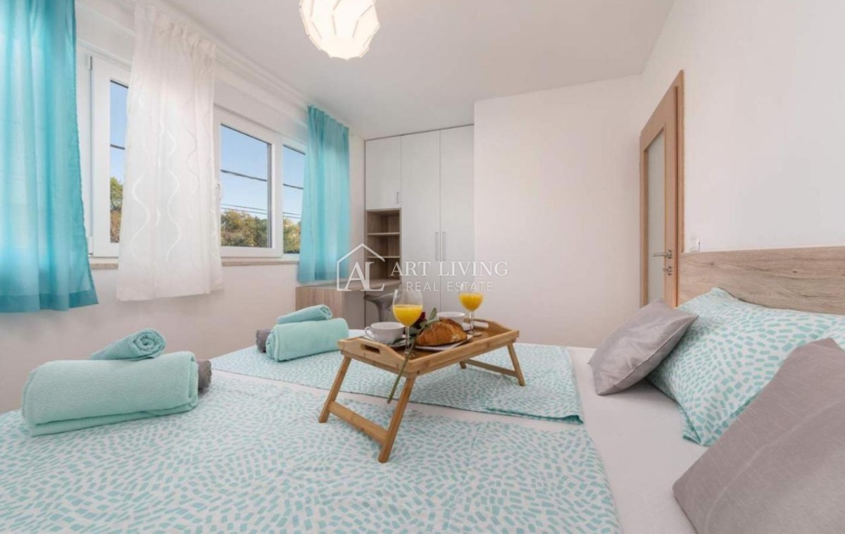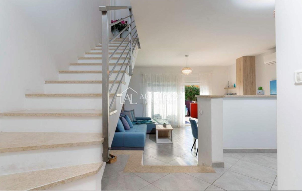 Kuća je kompletno ograđena sa uređenim vrtom površine 66 m2. Također ima dva vlastita parkirna mjesta te se prodaje kompletno namještena i uređena.