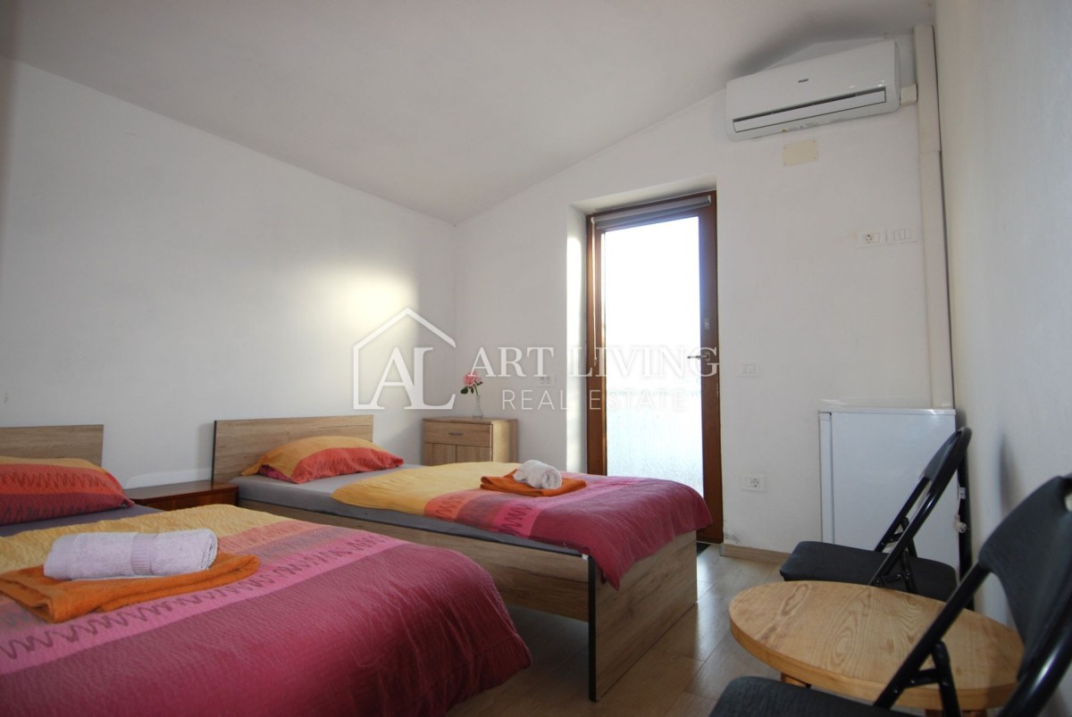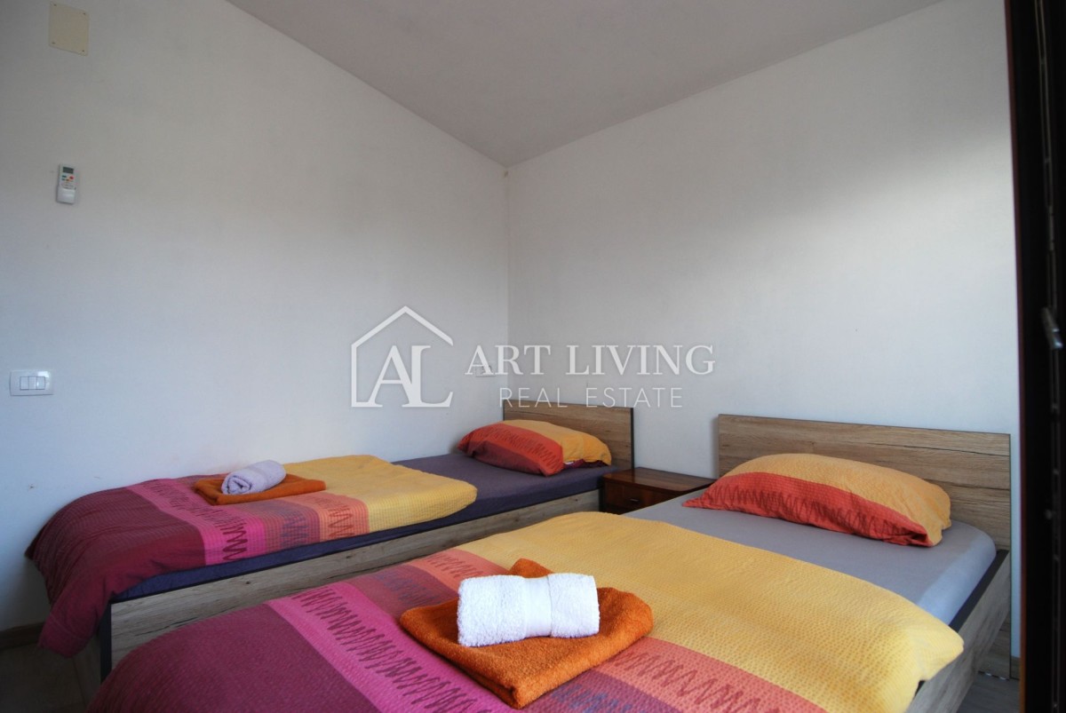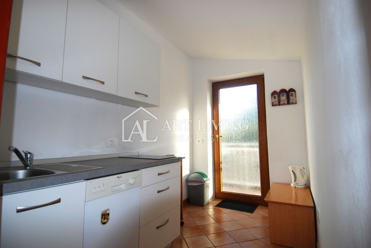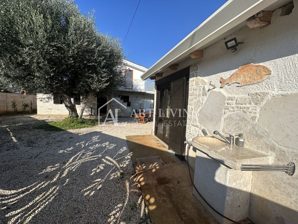 Kuća ukupne površine 225 m2 proteže se na 2 etaže; prizemlje i 1. kat i sastoji se od dva odvojena stana, dva studio apartmana te prave istarske konobe od 30m2.