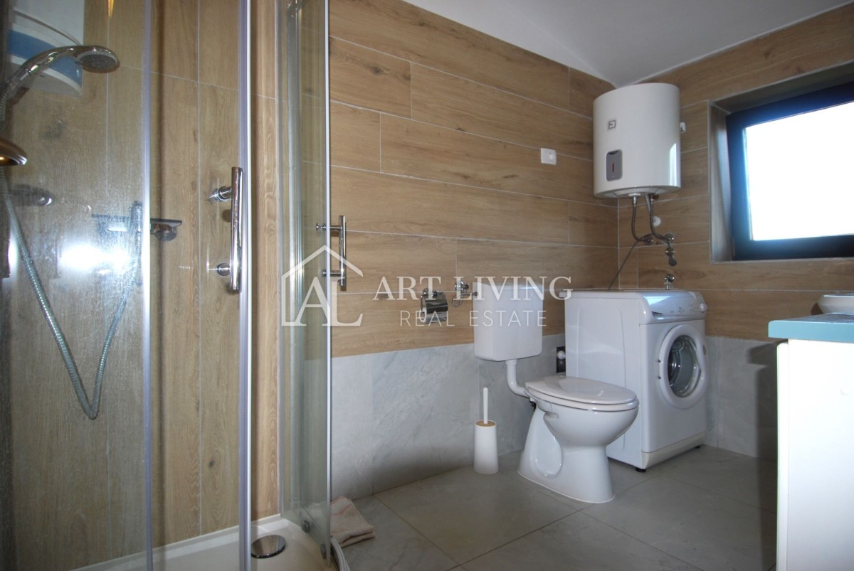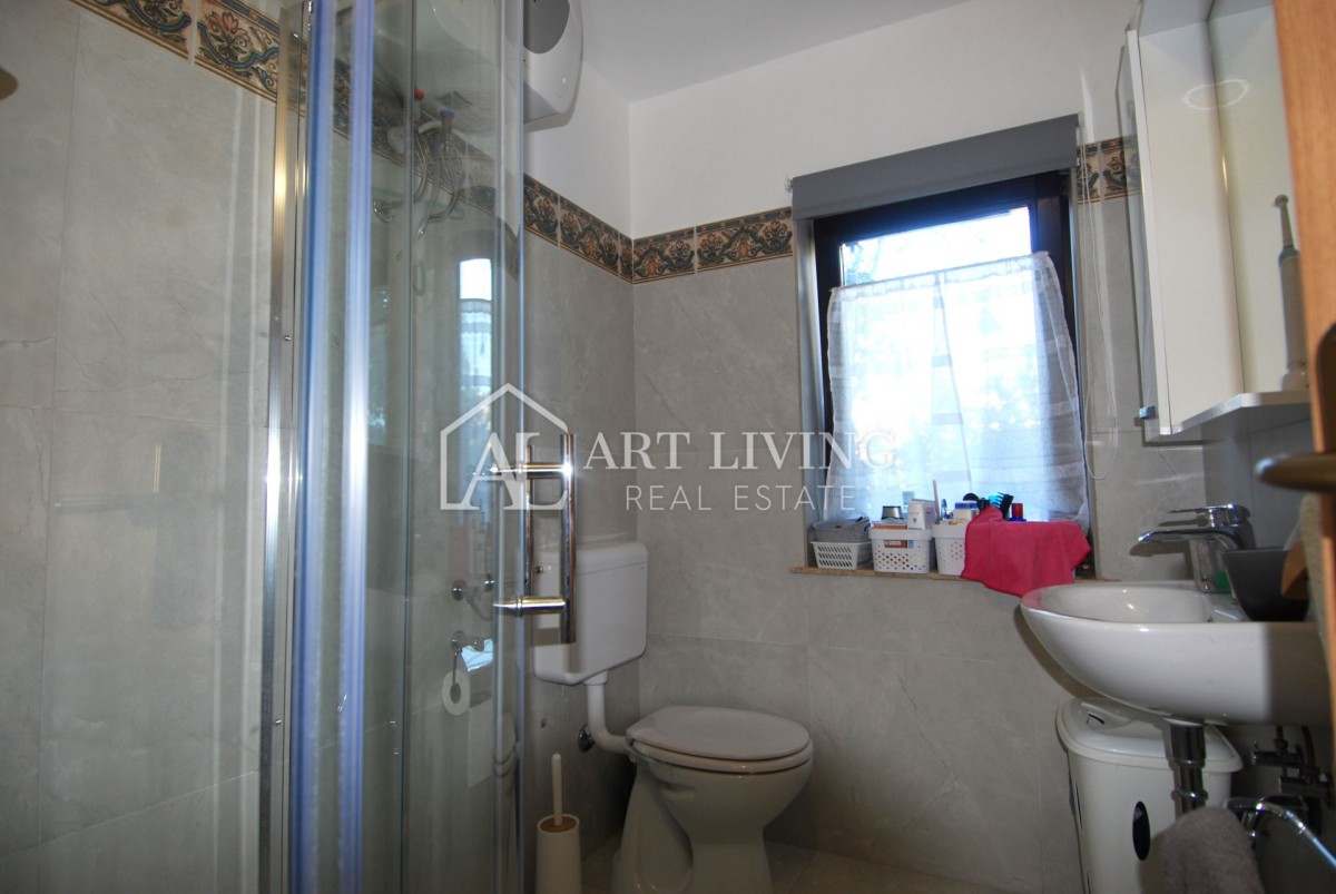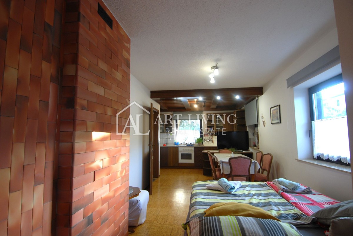 U prizemlju kuće nalazi se jednosoban stan koji se sastoji od dnevnog boravka, kuhinje i blagovaone, spavaće sobe, zasebnog wc-a, i ostave. Iz dnevnog boravka izlazi se na prostranu natkrivenu terasu i uređenu okućnicu. Prizemlju također pripada i zasebni studio apartman sa vlastitim ulazom koji se sastoji od spavaće sobe i kupaone. Ukupna površina prizemlja iznosi 122.86 m2