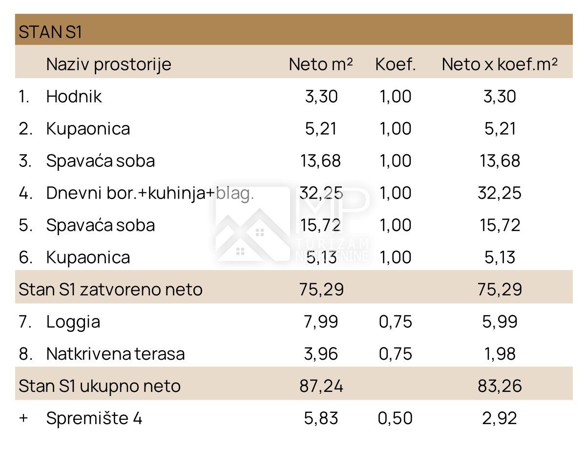 Prostrani prizemni stan u novogradnji oznake "S1" u zgradi br., a sastoji se od dvije spavaće sobe, dvije kupaonice i dnevnim boravkom s blagovaonicom i kuhinjom.