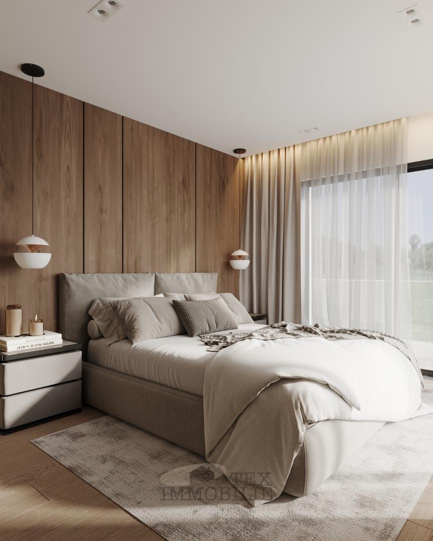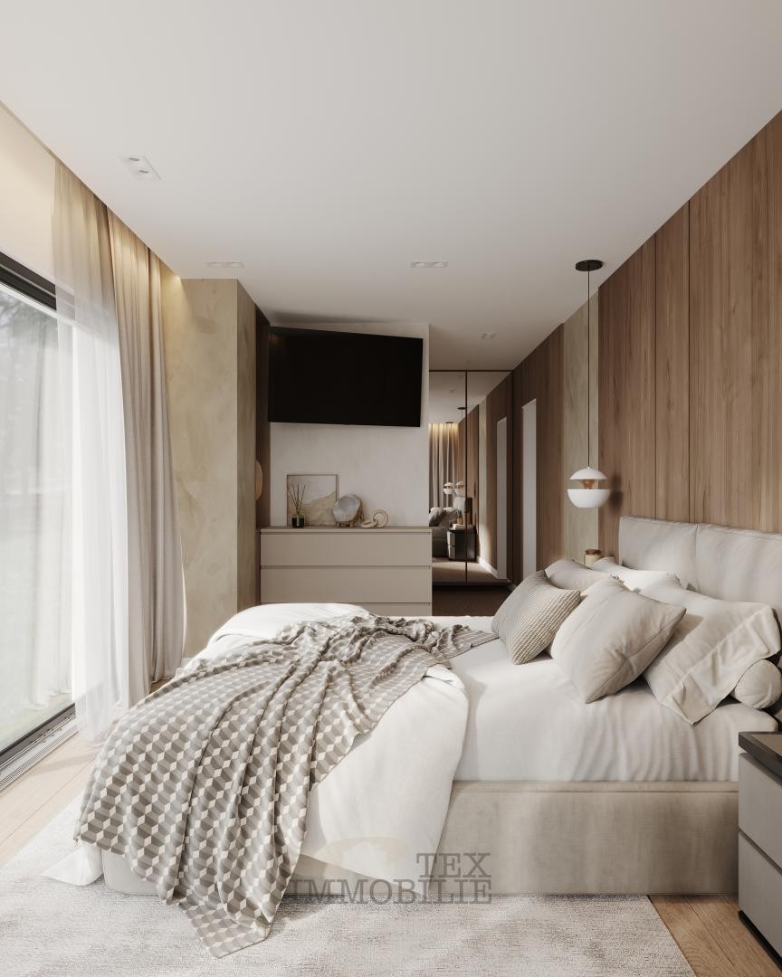Zakoračite u svijet elegancije i modernosti, gdje visokokvalitetni materijali i kutni dizajn stvaraju sofisticiranu atmosferu. Tri spavaće sobe, svaka s vlastitom kupaonicom, nude luksuznu udobnost i privatnost. Uživajte u prostranim dnevnim prostorima obasjanim prirodnim svjetlom, uključujući otvorenu kuhinju idealnu za kulinarske užitke. Centralni kamin potiče ugodna okupljanja, dok suvremeni dizajnerski elementi evociraju toplinu i stil kroz cijeli prostor.