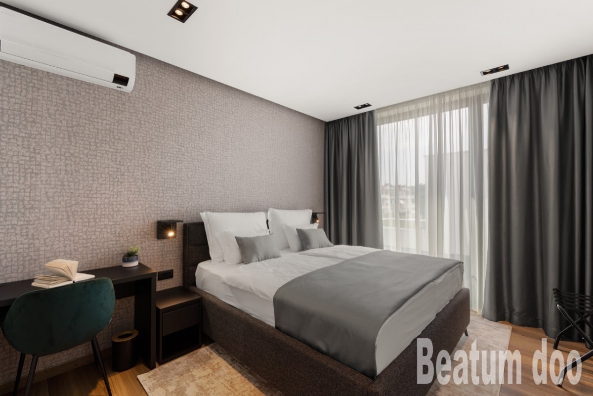 Spavaće sobe su opremljene bračnim krevetima s vrhunskim madracima linije Hespo Luxury Plus, ugradbenim ormarima, radnim stolom s foteljom Kave Home te noćnim lampama.