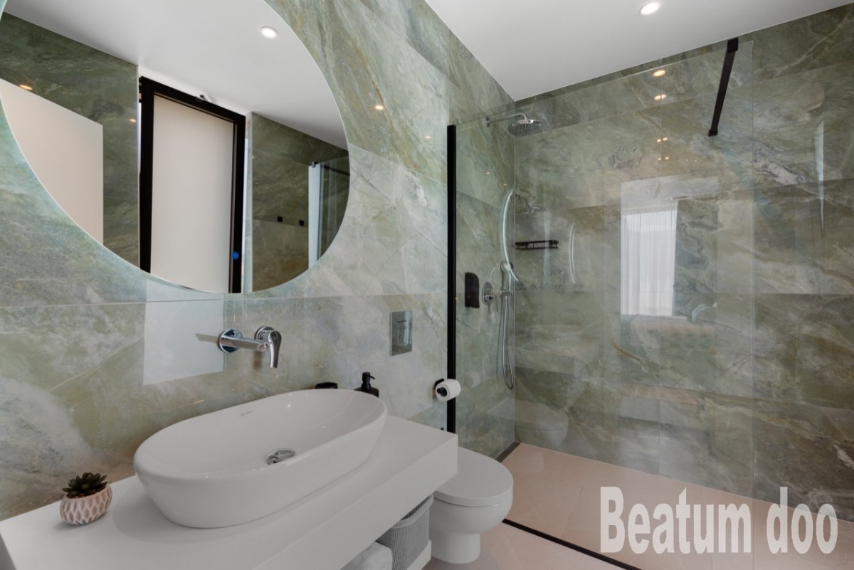 Vrhunska sanitarna oprema Duravit, slavine Grohe, odvodni sustavi Geberit i Tece, vodokotlići Grohe, Walk-in tuš.
