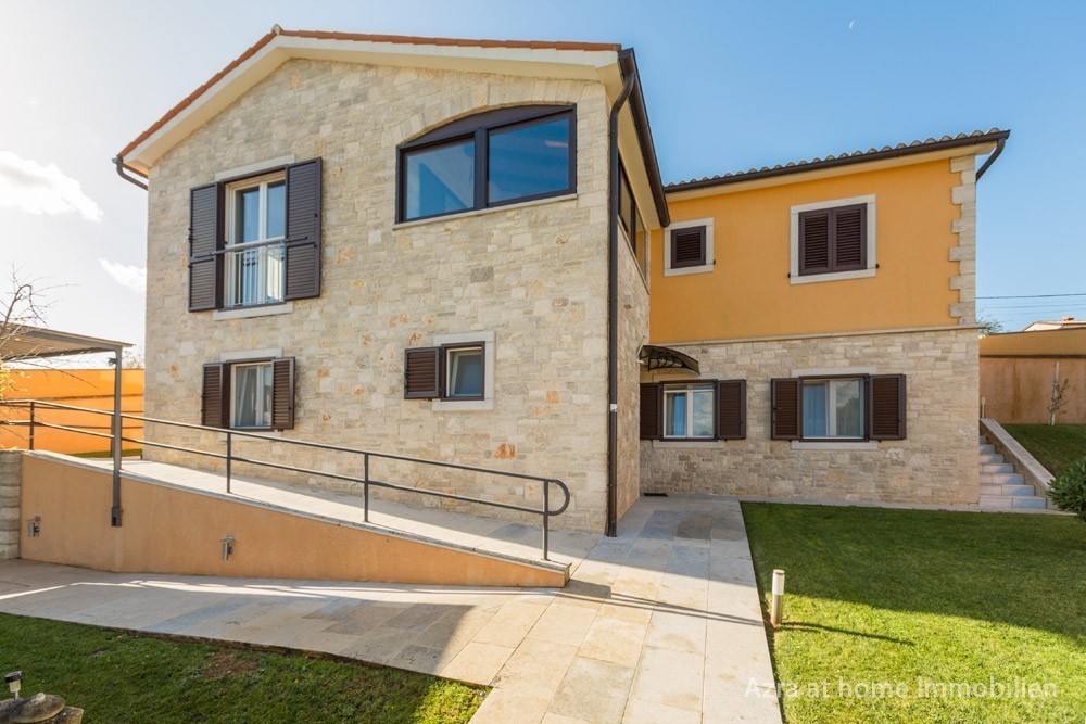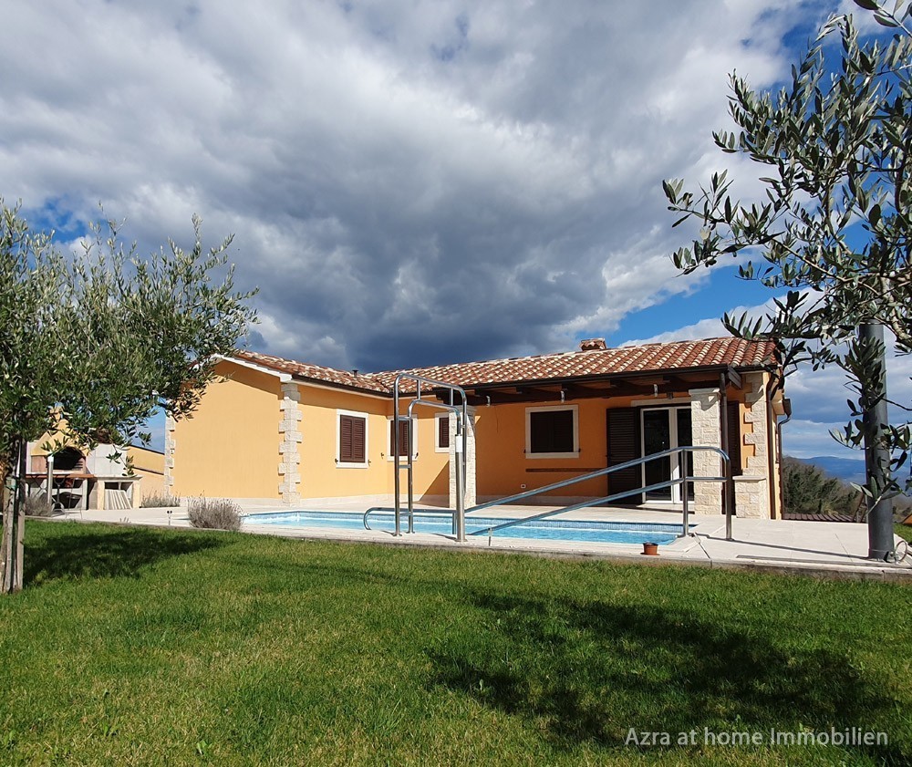 Na rubnom dijelu naselja , uklopljena u padinu brežuljka, nalazi se ova samostojeća kuća s panoramskim pogledom na okruženje od kojeg se ističe pogled na Motovun.