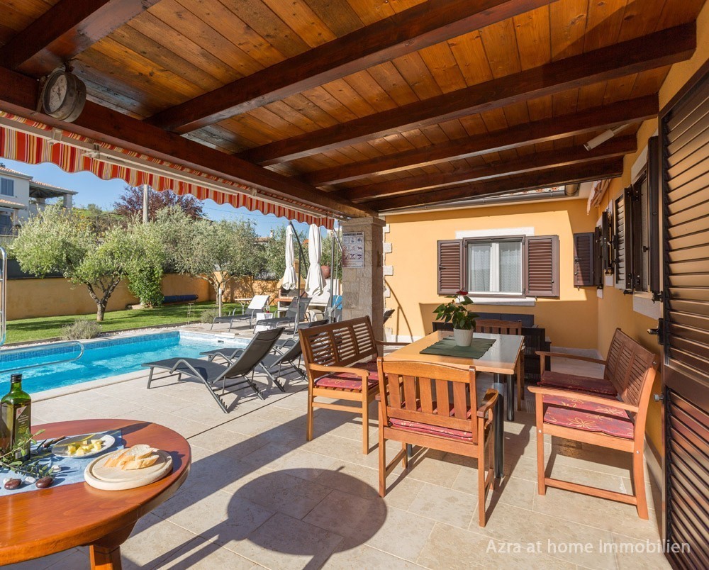 Na terasu u visokom prizemlju ( kat ) nadovezuje se bazen sa slatkom vodom 21m2. U tom dijelu dvorišta nalazi se i roštilj sa sudoperom i solarnim bojlerom. A uz bazen je i solarni tuš.