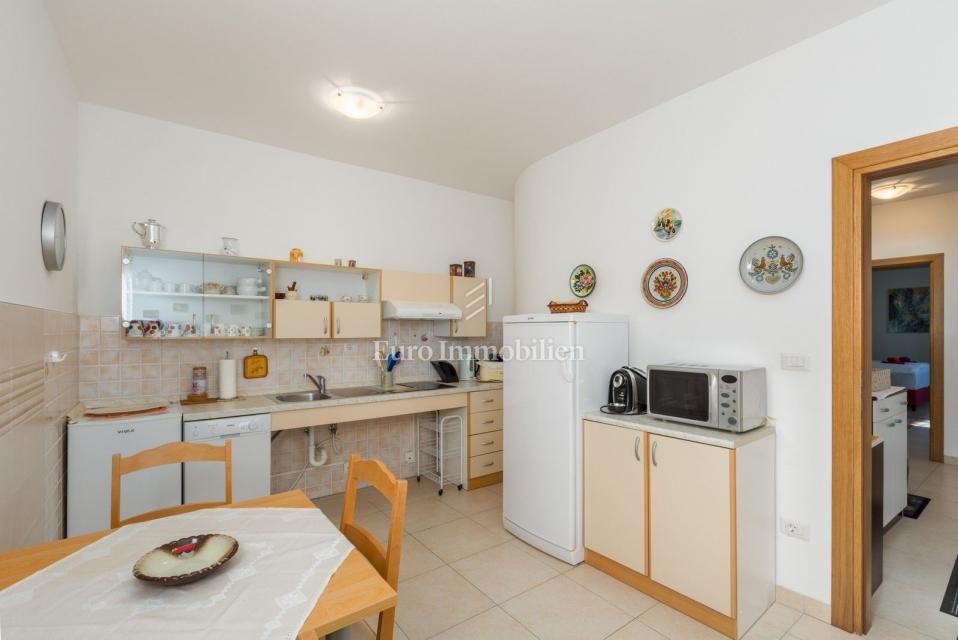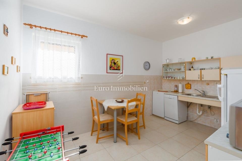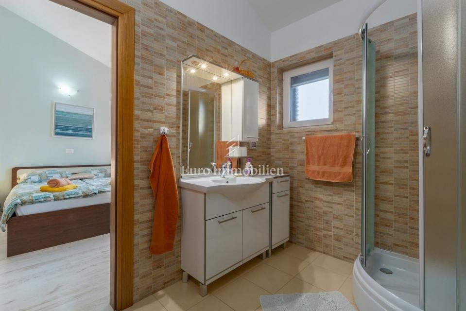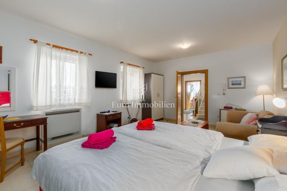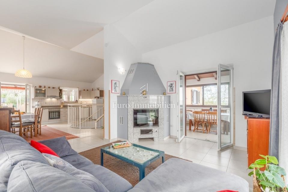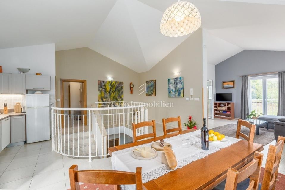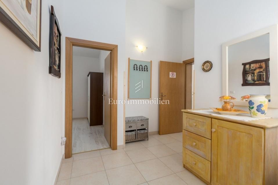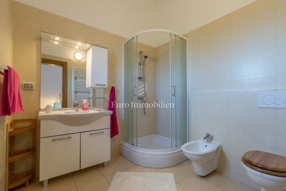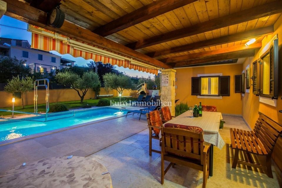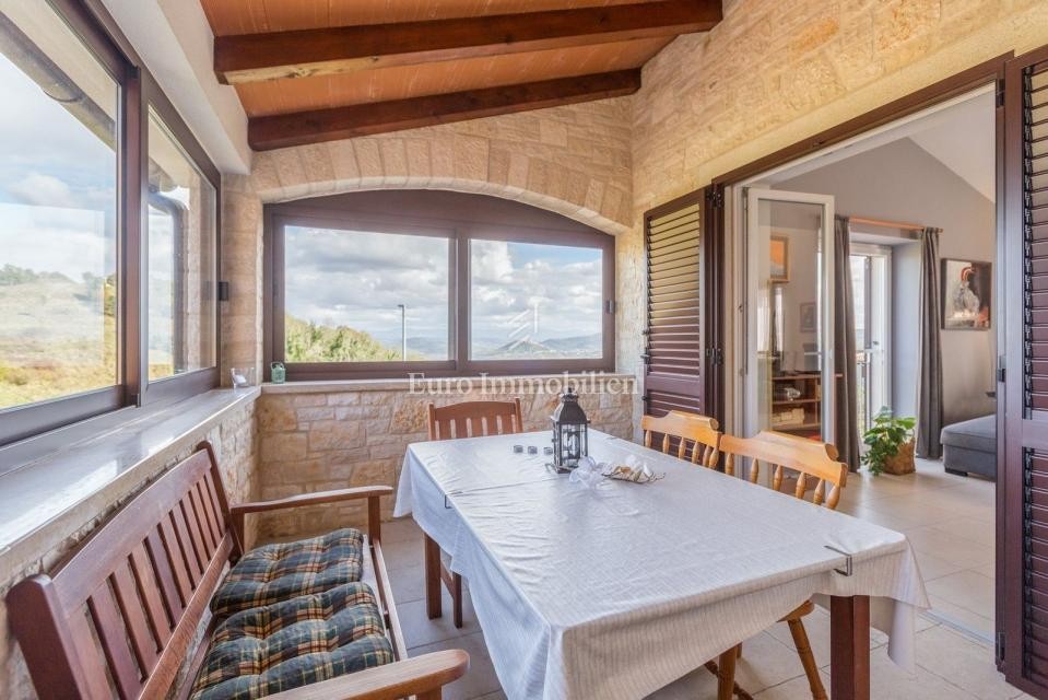 U prizemlju se nalaze dvije spavaće sobe, kuhinja s blagovaonom, kupaonica i veliko spremište. Unutarnjim stepenicama odlazi se na prvi kat na kojem su još dvije spavaće sobe, svaka sa svojom kupaonicom, predsoblje, wc + praonica, kuhinja, blagovaonica, dnevni boravak s kaminom te zatvorena terasa s prekrasnim otvorenim pogledom prema istoku. Iz dnevnog prostora izlazi se na natkrivenu terasu na zapadnoj strani i pristupa vrtu. U vrtu su bazen od 21m2, sunčalište, solarni tuš, roštilj na ugljen, travnjak s maslinikom i drugim mediteranskim biljkama. Okućnica je ograđena zidom visokim 2m, postavljeno je navodnjavanje i automatska vrata za ulaz na natkriveni parking (2 parkirna mjesta).