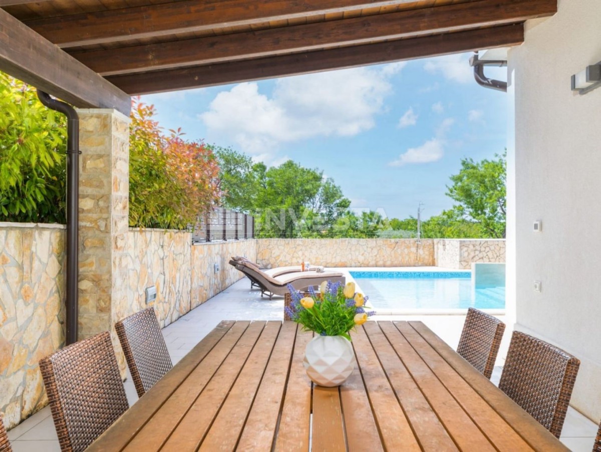 U mirnom naselju nedaleko od Vodnjana, na prodaju je elegantna vila za odmor koja spaja luksuz, udobnost i funkcionalnost, a smještena je na parceli površine 600 m².