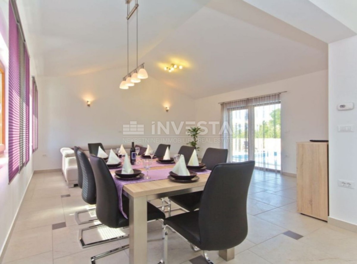 prostrani dnevni boravak s kuhinjom i blagovaonom otvorenog tipa, sa izlazom na natkrivenu terasu, sunčalište i bazen