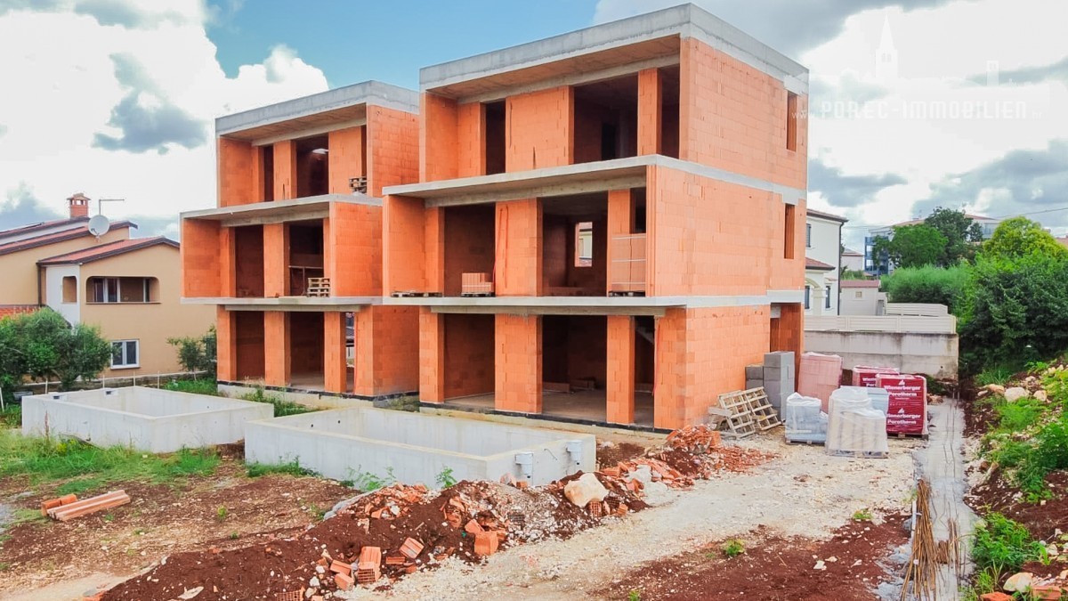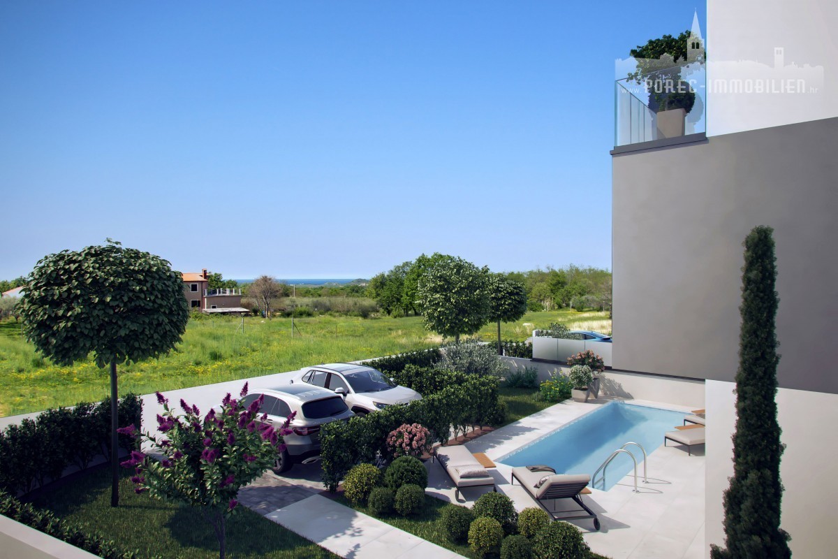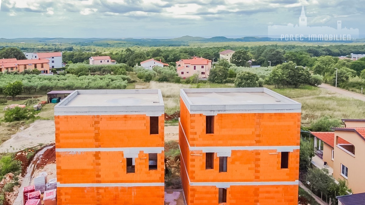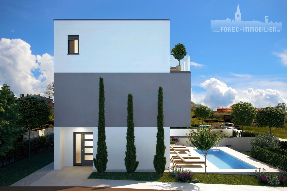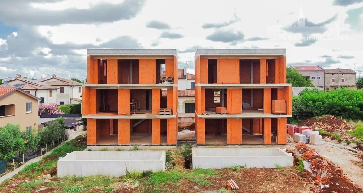 Vendesi la casa bifamiliare attualmente in costruzione, dotata di piscina e la splendida vista panoramica sul mare. La proprietà si trova a solo 5 minuti di auto dal mare e dal centro di Parenzo.