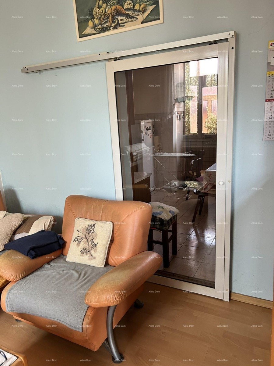 L'appartamento è in un'ottima posizione, prima fila al mare. L'appartamento è composto da un lungo corridoio, dove da un lato si trova il soggiorno, separato dalla cucina e dalla sala da pranzo tramite porte scorrevoli in vetro. Dall'altro lato del corridoio ci sono due camere da letto ed un bagno. Dalla cucina si accede al terrazzo sul retro dell'appartamento, dove si trovano anche un ampio cortile, un fabbricato ausiliario e un garage.