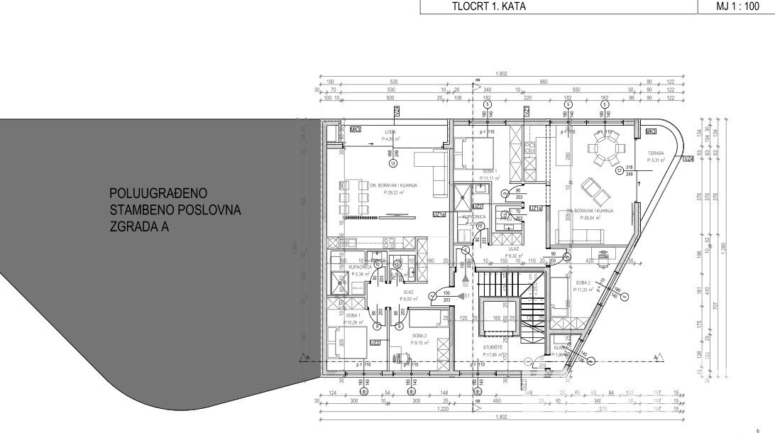 Tutti gli appartamenti dispongono di due camere da letto, soggiorno, cucina + sala da pranzo, bagno, WC e terrazza coperta.